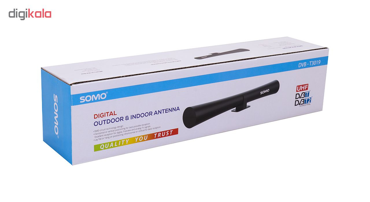 آنتن رومیزی سومو مدل DVB-T3019 طراحی بسیار کاربردی دارد که باعث شده آنتن پوشش دهی بسیار خوبی داشته باشد. یکی از مزیتهای این مدل این است که بیرون و داخل خانه قابل استفاده است. کاربر میتواند مثل آنتنهای معمولی آن را روی بام یا داخل تراس نصب کند. اما از وقتی آنتن در خانه باشد تنظیم کردن آن بسیار ساده است و نیازی به رفتن روی پشت بام نیست. آنتن به شکل یک استوانهی افقی طراحی شده و این نوع طراحی میتواند قدرت گیرندگی آن را تقویت کند. از طرف دیگر ابعاد کوچکی دارد و از این رو جای زیادی نمیگیرد و کاربر میتواند آنتن را به راحتی هر جایی قرار دهد. برای این که آنتن راحت بایستد، برایش یک پایه هم طراحی شده است. این آنتن توانایی گرفتن محدوده فرکانسی UHF را دارد و میزان Gain آن 5 تا 8 دسیبل است. گفنتی است این آنتن تنها برای تلویزیونهایی که گیرندهی دیجیتال داخلی دارند مناسب است. البته اگر گیرندهی دیجیتال جدا از تلویزیون موجود باشد هم آنتن قابل استفاده خواهد بود. مدل DVB-T3019 همچنین از هر دو نوع DVB-T2 و DVB-T تیونر پشیتبانی میکند و از این رو با تلویزیونهای مختلف سازگاری دارد. برای این که کاربر برای قرار دادن آنتن در جای مناسب دچار مشکل نشود، برای آن یک کابل آنتن کواکسیال با طول 1.8 متر در نظر گرفته شده است.