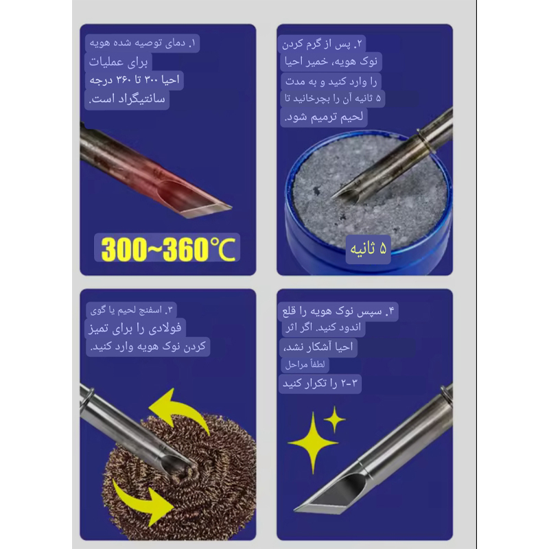 برای استفاده از این محصول کافیست زمانی که هویه داغ شد و به بالا ترین دمای مطلوب رسید نوک هویه را در پاک‌کننده فرو کنید و سپس نازل جوشکاری را با اسفنج لحیم کاری تمیز کنید تا نوک هویه به حالت مطلوب خود بازگردد. اگر اولین اثر مشخص نیست، مراحل را 2-3 بار تا رسیدن به اثر مورد انتظار تکرار کنید. این محصول که برای علاقه‌مندان، تکنسین‌ها و متخصصان ایده‌آل است، یک راه‌حل آسان برای نگهداری تجهیزات لحیم‌کاری شما ارائه می‌دهد.