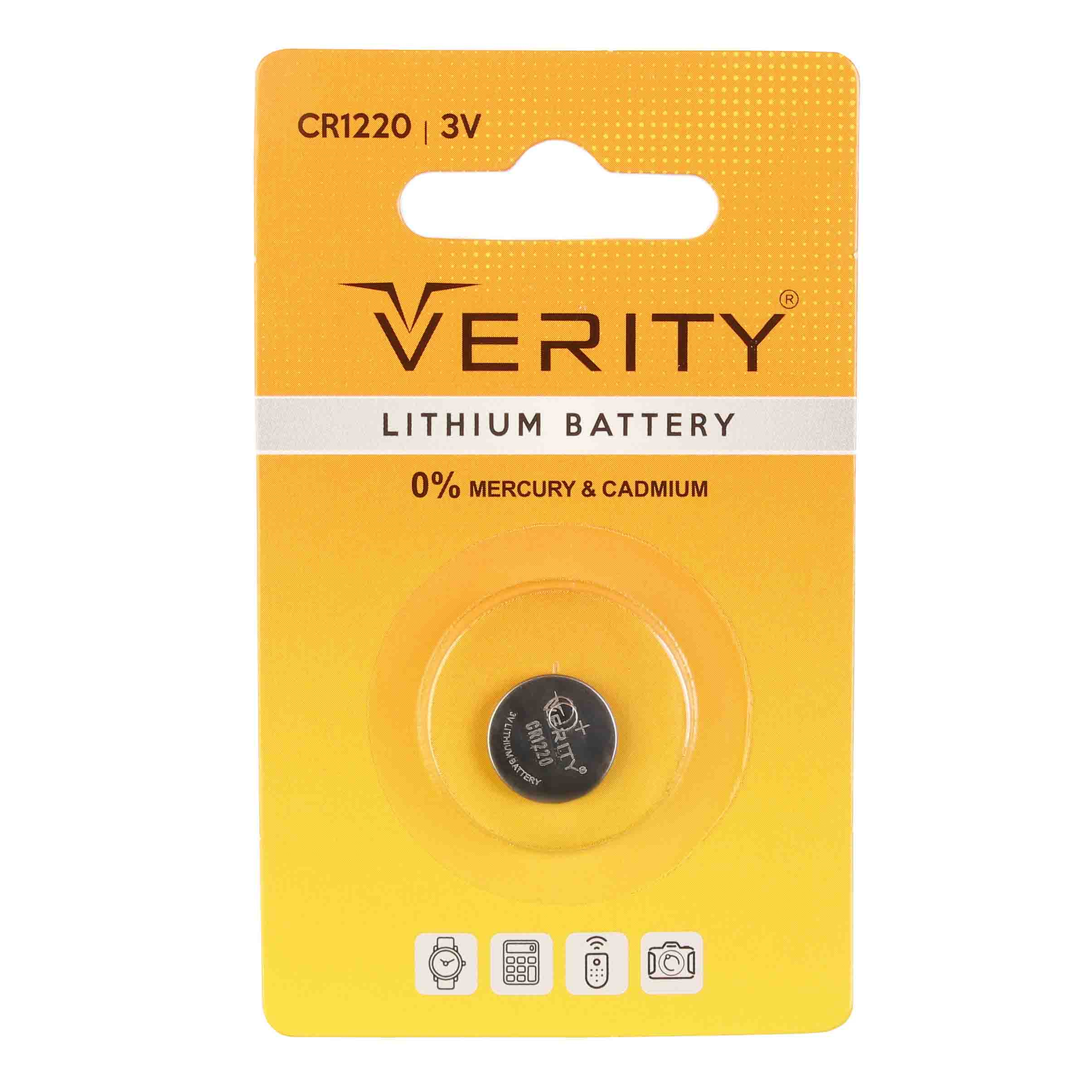 باتری CR1220 وریتی دارای قطری به اندازه 12 میلی متر و و ضخامت 2 میلی متر میباشد.این باتری دارای تکنولوژی لیتیومی میباشد .