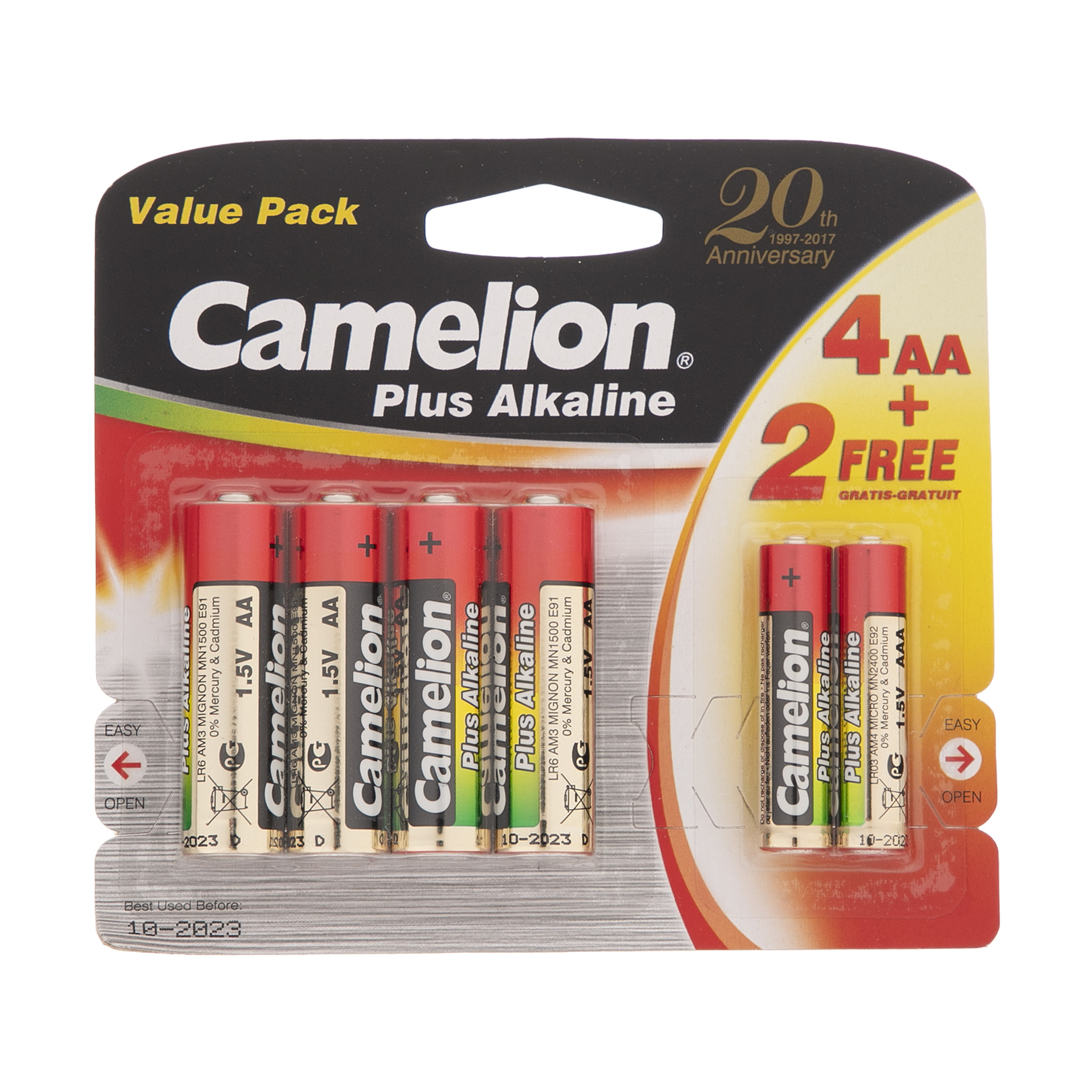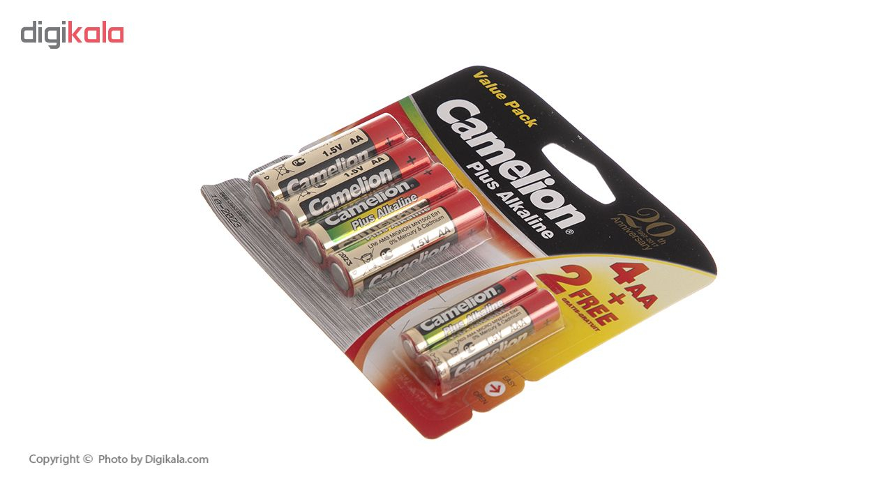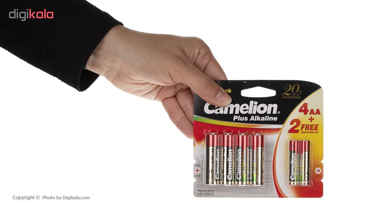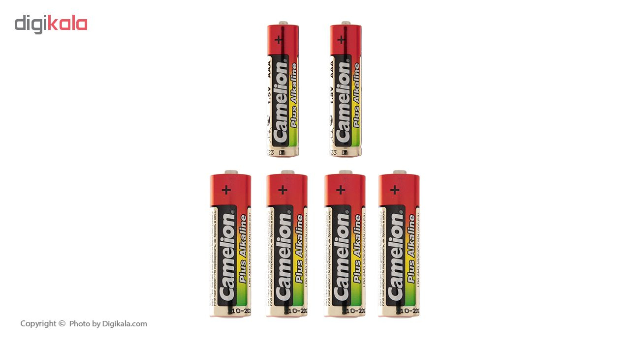 با خرید این مدل از محصولات «کملیون» (Camelion) صاحب 4 باتری قلمی و 2 باتری نیم‌قلمی خواهید شد و تا مدت‌ها هیچ نیازی به تهیه‌ی باتری نخواهید داشت. تکنولوژی ساخت این باتری‌ها آلکالاین بوده و به همین دلیل ماندگاری طولانی‌مدت دارند. منظور از ماندگاری طولانی این است که حتی اگر قصد استفاده از باتری‌ها را نداشته باشید، انرژی آن‌ها به این زودی هدر نمی‌رود و تا چند سال باقی می‌ماند. باتری‌های آلکالاین براساس واکنش شیمیایی بین روی و اکسید منگنز ساخته شده‌اند و نسبت ‌به باتری‌های معمولی روی-کربن تراکم نیروی بیشتر و ماندگارتری دارند. به‌طور تخمینی می‌توان گفت، تراکم نیروی باتری‌های آلکالاین دو برابر بیشتر از باتری‌های معمولی است. همچنین نشت و ازدست‌‌دادن نیرو در صورت استفاده‌‌نشدن به مدت طولانی در باتری‌های آلکالاین بسیار کمتر از باتری‌های معمولی است؛ بنابراین می‌توانید این باتری‌ها را به مدت طولانی‌ در کمد یا کشو میزتان نگه دارید و نگران هیچ‌چیز نباشید. بسته به نوع و کیفیت، باتری‌های آلکالاین قبل از استفاده تا 7 سال انرژی را در خود نگه می‌دارند و تنها 5درصد از آن را در طول زمان از دست می‌‎دهند. ولتاژ هریک از این باتری‌ها 1.5 ولت است و شما می‌توانید با استفاده از آن‌ها انرژی مورد نیاز دستگاه‌های مختلف مانند اسباب‌بازی، ماوس و کیبورد بی‌سیم، ساعت، رادیو، چراغ‌قوه و… را تامین کنید.