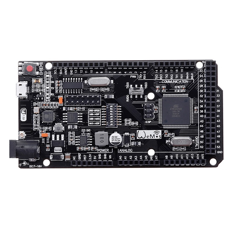 طراحی مبتنی بر برد آردوینو MEGA 2560 مبتنی بر هسته ESP8266 دارای WIFI داخلی ولتاژ کاری: کانکتور USB و جک آداپتور 7-16 ولت 54 ورودی خروجی دیجیتال IO دارای جک آداپتور دارای پورت micro USB
