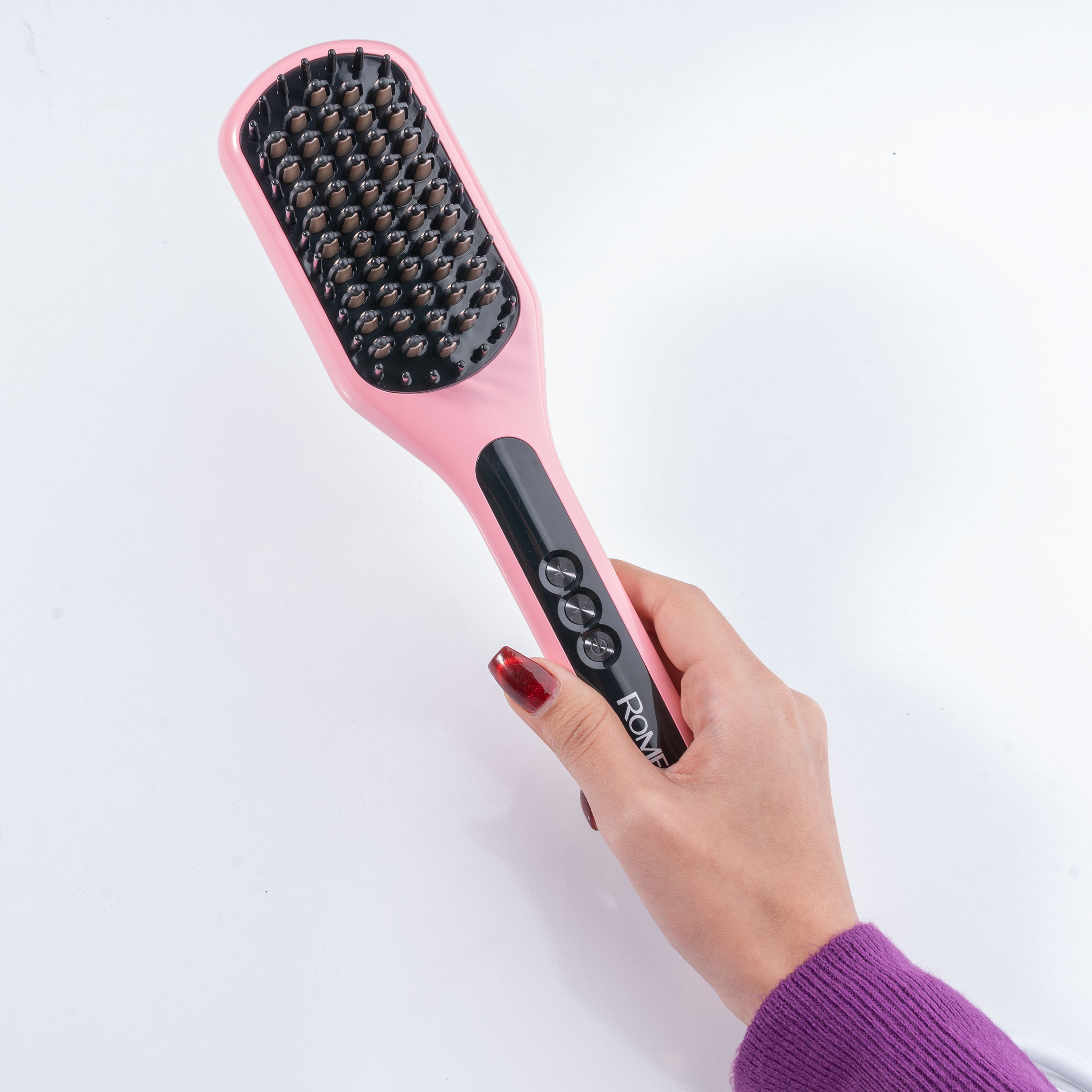 برس حرارتی رومئو مدل RM-7575 ابزاری کاربردی و حرفهای برای آراستگی و مراقبت از مو است. این دستگاه با توان مصرفی ۵۰ وات و قابلیت تنظیم دما در ۱۱ سطح مختلف، بازه حرارتی بین ۴۵۰ تا ۹۵۰ درجه فارنهایت را پوشش میدهد تا متناسب با نوع و جنس مو، دمای مناسب انتخاب شود. صفحهنمایش LCD روی بدنه، دمای فعلی دستگاه را بهصورت دقیق نمایش میدهد و کنترل کاربر را سادهتر میکند.
