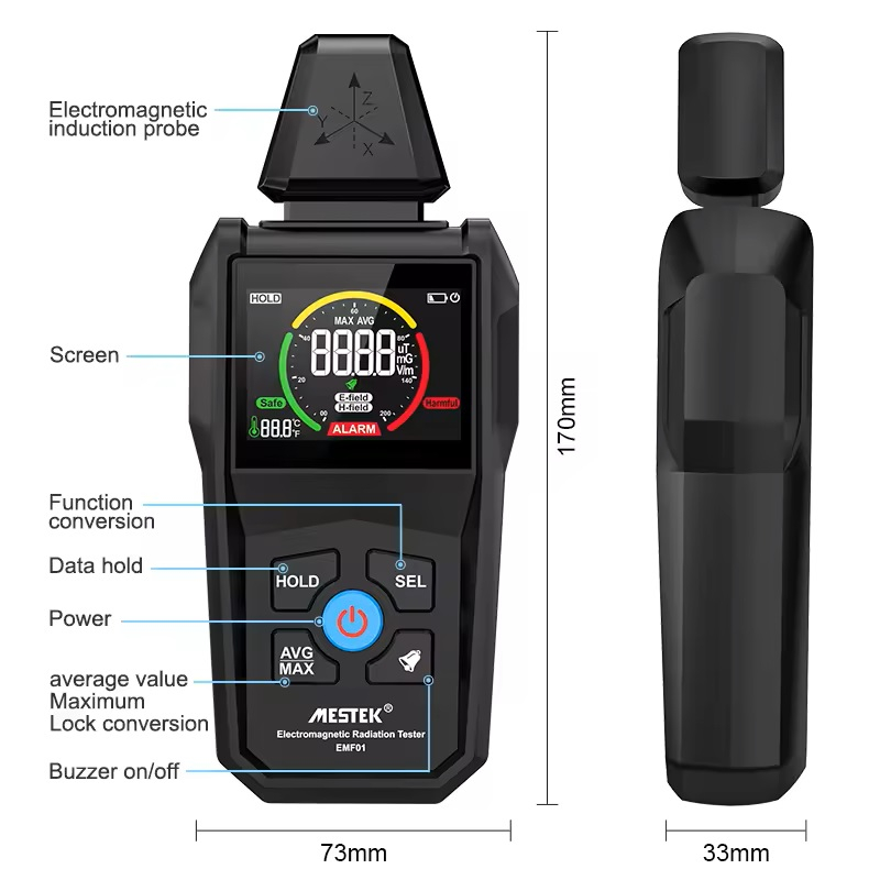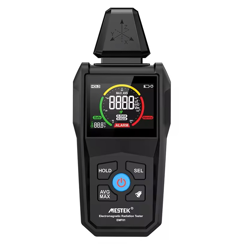 دستگاه سنجش پرتوی الکترومغناطیسی EMF01 ساخت کمپانی مستک است . واحد میدان الکتریکی بر حسب V/m با دقت یکV/m و رنج اندازه گیری 1V/m تا 9999V/m و واحد میدان مغناطیسی بر اساس µT با دقت 0.01µT و رنج اندازه گیری 0 µT تا 74 µT می باشد که میتواند آزمایش کند تا به نتیجه آزمایش مطلوب برسید . از این دستگاه برای آزمایش و یادگیری وضعیت اشعه الکترومغناطیسی electromagnetic radiation در محیط داخلی و خارج استفاده می شود. مجهز به حسگر تابش الکترومغناطیسی داخلی است که می تواند مقدار تابش را در صفحه دیجیتالی LCD نمایش دهد پس از پردازش توسط میکرو تراشه کنترل عدد نمایش میدهد . با توجه به نتیجه آزمایش ، می توانید پردازش معقول و یا اقدامات پیشگیری مؤثر در برابر اشعه الکترومغناطیسی electromagnetic radiation انجام دهید. موارد مورد استفاده : نظارت بر اشعه الکترومغناطیسی، خانه و آپارتمان ، دفتر ، سایت در فضای باز و صنعتی؛ تلفن همراه ، رایانه ، تلویزیون ، یخچال و فریزر کابل با ولتاژ بالا است .