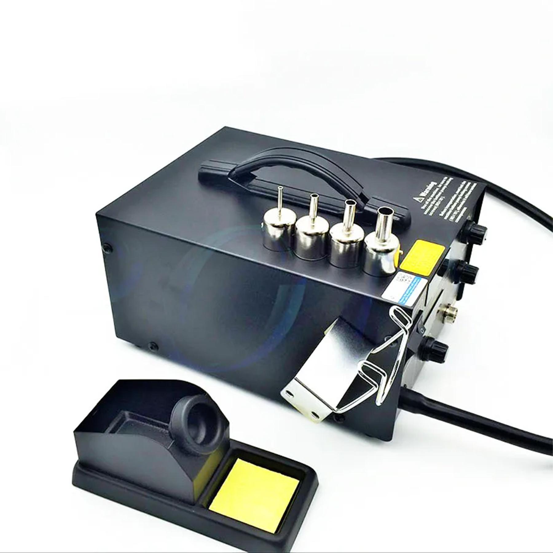 دارای چهار سر نازل هوای گرم نوک هویه تیز صاف مخصوص SMD دارای دو صفحه نمایش دیجیتال تنظیم دما قابلیت تنظیم هوای خروجی دارای اسفنج نسوز پایه هویه فلزی توان هوای گرم 270 وات رنج دمایی 150 تا 500 درجه سلسیوس توان هویه 45 وات رنج دمایی 200 تا 480 درجه سلسیوس توان کمپرسور باد از 6 تا 23 وات هوادهی بیشینه 24 لیتر بر ساعت