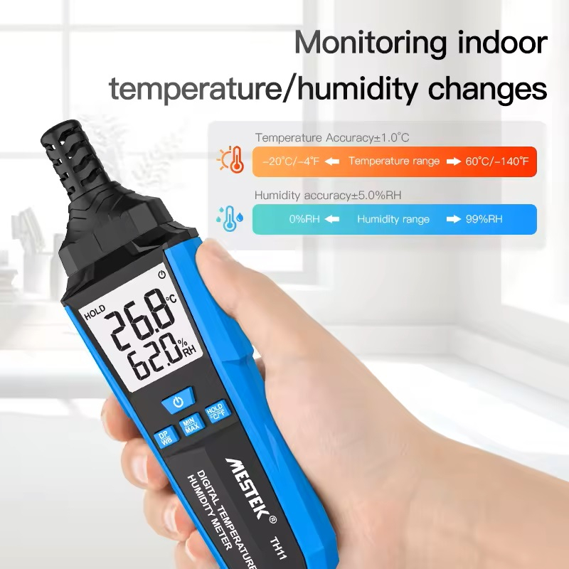 هیدروترمومتر دیجیتال نام دیگر رطوبت سنج و دما سنج محیطی می باشد.این رطوبت سنج توسط شرکت پژواک کالای نوین ایرانیان وارد گردیده است هیدروترمومتر یا رطوبت سنج مستک مدل TH11 برای اندازه گیری رطوبت و دما در محیط های صنعتی، نیمه صنعتی، کارخانه، گلخانه ها، موسسات تحقیقاتی و بهداشتی و… مورد استفاده قرا می گیرد. به عبارت دیگر از این دستگاه می توان در هر محیطی که نیاز به اندازه گیری دما و یا رطوبت محیط داشته باشد، استفاده کرد. در این دستگاه، یک بازه معین برای نشان دادن دما و رطوبت وجود دارد. این دستگاه دارای طراحی منحصر به فرد و جنس عالی و ساخته شده بر اساس استاندارد های جهانی می باشد.