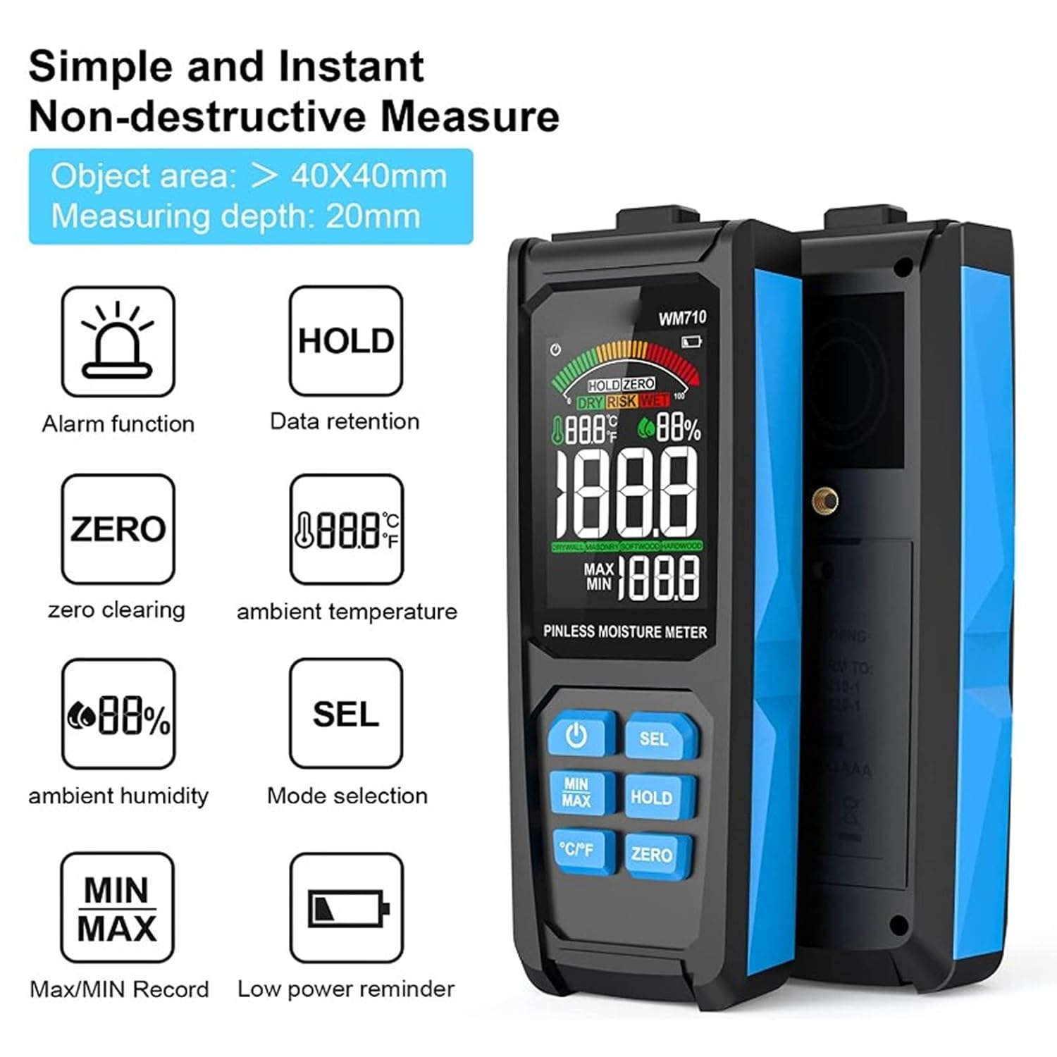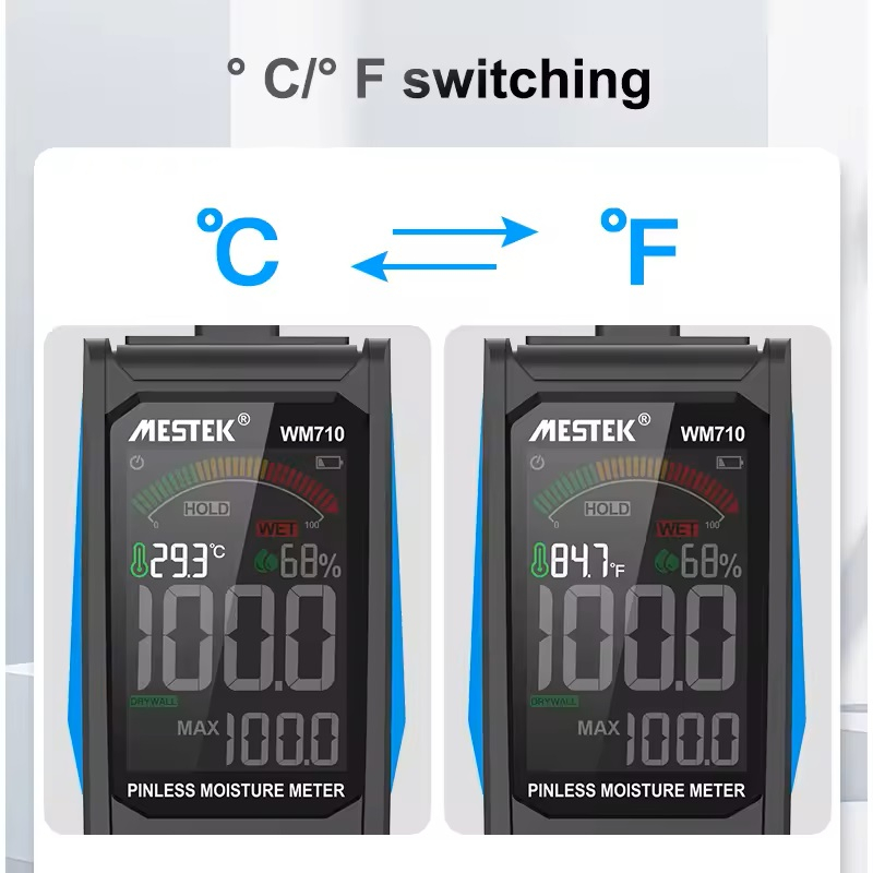 رطوبت سنج مدل WM710 ساخت شرکت مستک میباشد.این دستگاه توسط شرکت پژواک کالای نوین ایرانیان وارد گردیده است دستگاه رطوبت سنج WM710 با عملکرد 3 در 1. رطوبت سطح مورد نظر را تا 2 سانتی متر / 4/3 اینچ عمق + رطوبت و دمای محیط را اندازه گیری می کند. رطوبت را از عمق (تا 2 سانتی متر) تشخیص می دهد، نه فقط از سطح این ماده پس از اندازه گیری قطعه دست نخورده خواهد ماند زیرا دستگاه از فناوری الکترومغناطیسی استفاده می کند و از پین برای سوراخ کردن استفاده نمی کند.این دستگاه نمایش رنگی بصری بزرگی دارد همچنین به دلیل هشدار دیداری و شنیداری با دقت بیشتری اندازه گیری خواهید کرد.این دستگاه رطوبت مورد نظر (گچ، چوب و غیره) به علاوه رطوبت و دمای محیط را نشان می دهد. دارای حافظه داخلی میباشد . دقت این دستگاه رطوبت سنج ±5% میباشد . از این دستگاه برای تست رطوبت چوب سخت، چوب نرم، گچ تخته، دیوار، دیوار کاهگلی، بتن، مقوا، آجر… مورد استفاده قرار میگیرد