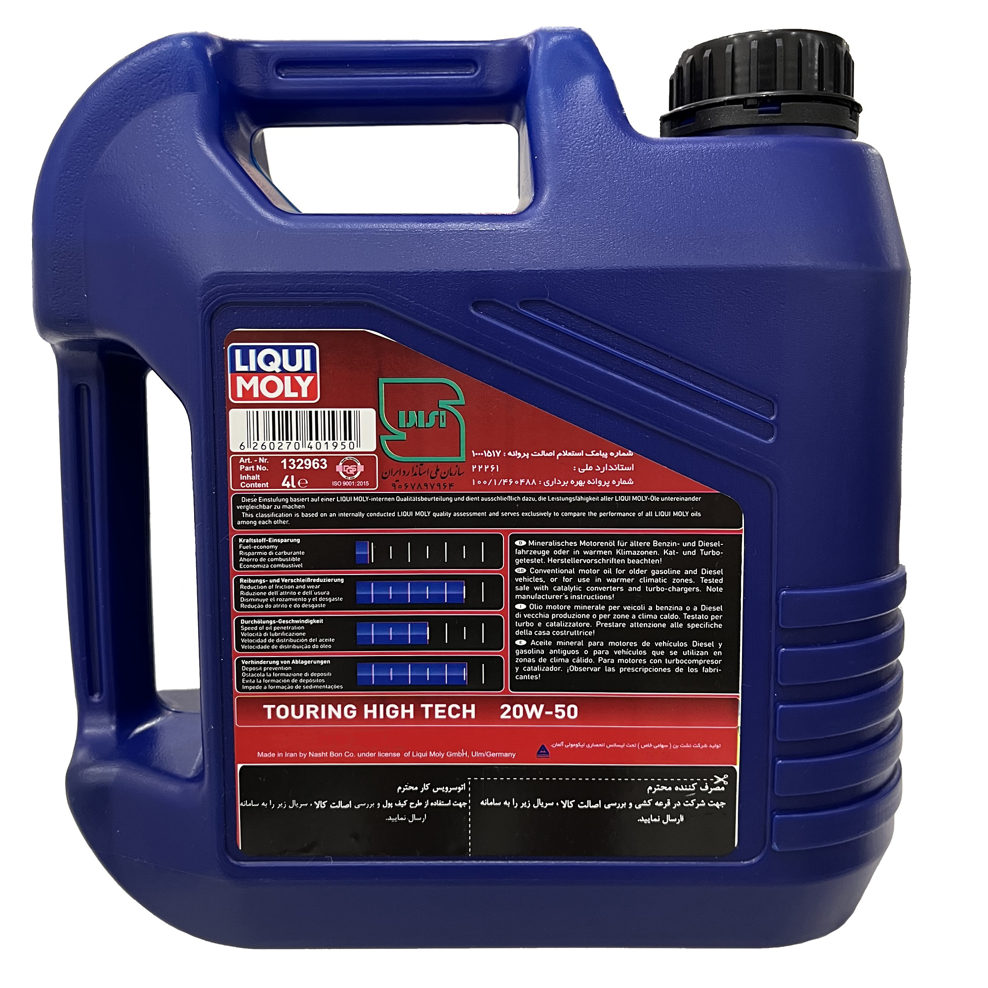 این محصول، روغن موتور لیکومولی TOURING HIGH TECH با گرانروی 20W50 و کیفیت SN است. توجه کنید که این محصول جدیدترین تولین این شرکت است و با مدل قبلی متفاوت است و کیفیت به مراتب بالاتری دارد. این روغن در حجم های 4 و 5 لیتری تولید شده است. این محصول یکی از با کیفیت ترین روغن موتورها در این گروه میباشد. این روغن موتور این امکان را دارد در هر دمایی بالاترین کارایی را دارا باشد. روغن پایه این روغن موتور به صورت معدنی و با افزودنی های وارداتی از کشور آلمان تولید مشود. و با قدرت روانکاری مناسب و پوشش دهی مناسب قطعات، باعث کاهش مصرف سوخت گردیده و قابل استفاده دراکثر خودروهای روز خارجی و داخلی میباشد. روغن موتورهای معدنی ساختار بزرگتری نسبت به روغنهای سینتتیک دارند که این امر باعث میشود روغن کاری سریعتری انجام شود. این ویژگی باعث میشود موتورهای با ساختار قدیمی تر نیز روغن کاری بهتری داشته باشند. یکی از مزایای این روغن موتور، تحمل بالای دمای موتور خودرو است. با ترکیب مناسب روغن پایه و افزودنیها، این روغن موتور را به یک محصول منحصر به فرد تبدیل کرده است که تقریباً رقیبی در بازار ایران ندارد. این روغن محول شرکت نشت بن، نماینده انحصاری محصولات Liqui Moly آلمان است که از سال 1375 محصولات لیکومولی را با بالاترین سطح کیفی در بازار ایران عرضه می نماید.
