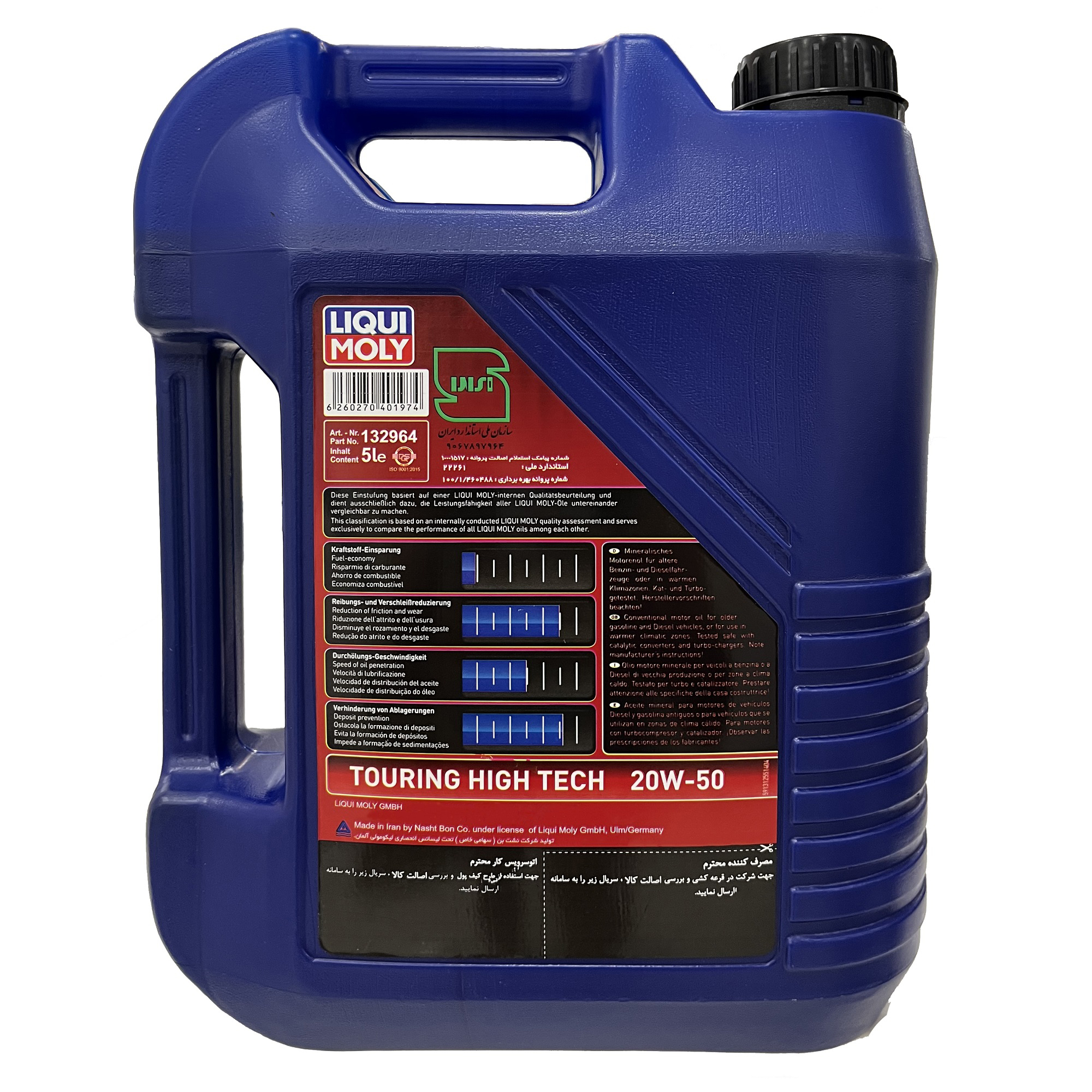 این محصول، روغن موتور لیکومولی TOURING HIGH TECH با گرانروی 20W50 و کیفیت SN است. توجه کنید که این محصول جدیدترین تولین این شرکت است و با مدل قبلی متفاوت است و کیفیت به مراتب بالاتری دارد. این روغن در حجم های 4 و 5 لیتری تولید شده است. این محصول یکی از با کیفیت ترین روغن موتورها در این گروه میباشد. این روغن موتور این امکان را دارد در هر دمایی بالاترین کارایی را دارا باشد. روغن پایه این روغن موتور به صورت معدنی و با افزودنی های وارداتی از کشور آلمان تولید مشود. و با قدرت روانکاری مناسب و پوشش دهی مناسب قطعات، باعث کاهش مصرف سوخت گردیده و قابل استفاده دراکثر خودروهای روز خارجی و داخلی میباشد. روغن موتورهای معدنی ساختار بزرگتری نسبت به روغنهای سینتتیک دارند که این امر باعث میشود روغن کاری سریعتری انجام شود. این ویژگی باعث میشود موتورهای با ساختار قدیمی تر نیز روغن کاری بهتری داشته باشند. یکی از مزایای این روغن موتور، تحمل بالای دمای موتور خودرو است. با ترکیب مناسب روغن پایه و افزودنیها، این روغن موتور را به یک محصول منحصر به فرد تبدیل کرده است که تقریباً رقیبی در بازار ایران ندارد. این روغن محول شرکت نشت بن، نماینده انحصاری محصولات Liqui Moly آلمان است که از سال 1375 محصولات لیکومولی را با بالاترین سطح کیفی در بازار ایران عرضه می نماید.