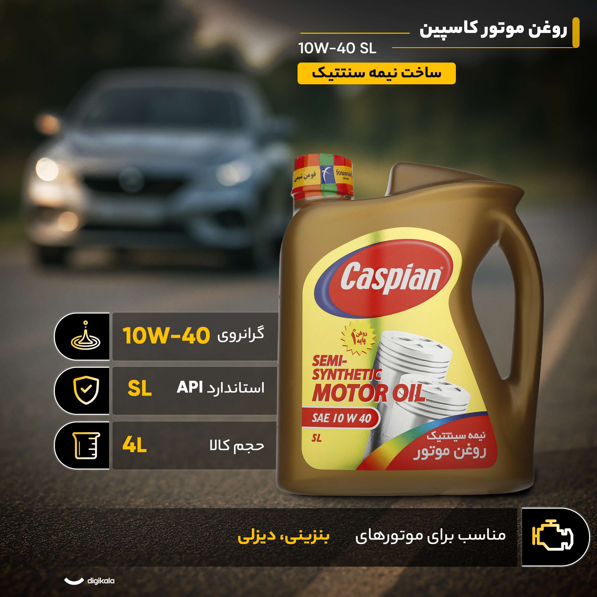 فرموله شده با روغن پایه نیمه سینتتیک و افزودنی های اورجینال اروپایی، استارت سریع و آسان موتور در هوای سرد زمسـتان، پایداری غلـظت فیلم روغن در هوای گـرم تابستان، روانی و آسانی کار موتور، صرفه جویی در مصرف سوخت، کاهش اصطکاک و استهلاک قطعات موتور و جلوگیری از رسوبات مضر، محافظ موتور در مقابل اکسیداسیون و خوردگی، تحت لیسانس شرکت کاسپین اینترنشنال انگلستان، مناسب برای خودروهای مدل 2001 به بالا. روغن موتور کاسپین نیمه سنتتیک چهار لیتری مظروف پلاستیکی 10W-40 SL یک محصول با سطح کیفی API SL با روغن پایه نیمه سینتتیک و درجه گرانروی یا لزجیت SAE J300 10W-40 با رعایت الزامات استاندارد API SL,API CF مناسب خودروهای با سوخت بنزینی می‌باشد.