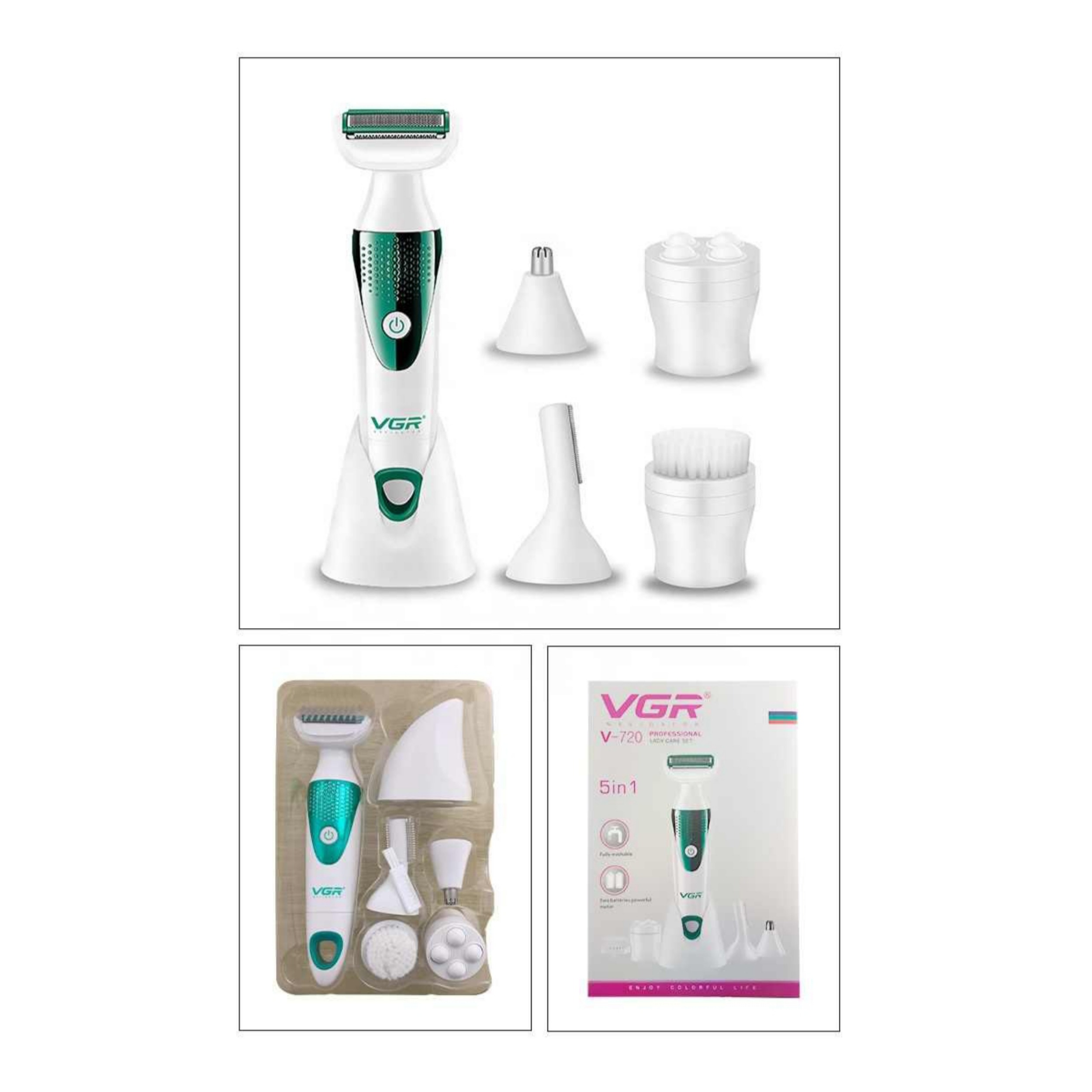 وی جی ار مدل 720 ست ماشین اصلاح صورت و بدن میباشد که کاملا ضدآب و با 2 باطری نیم قلمی قابل استفاده میباشد سری های این دستگاه عبارتند از سری اصلاح مو بینی، سری ماساژور، سری اصلاح موی ابرو همراه با شانه برای بلند یا کوتاه اصلاح کردن،سری شیور بدن و صورت و سری پاکسازی صورت است.