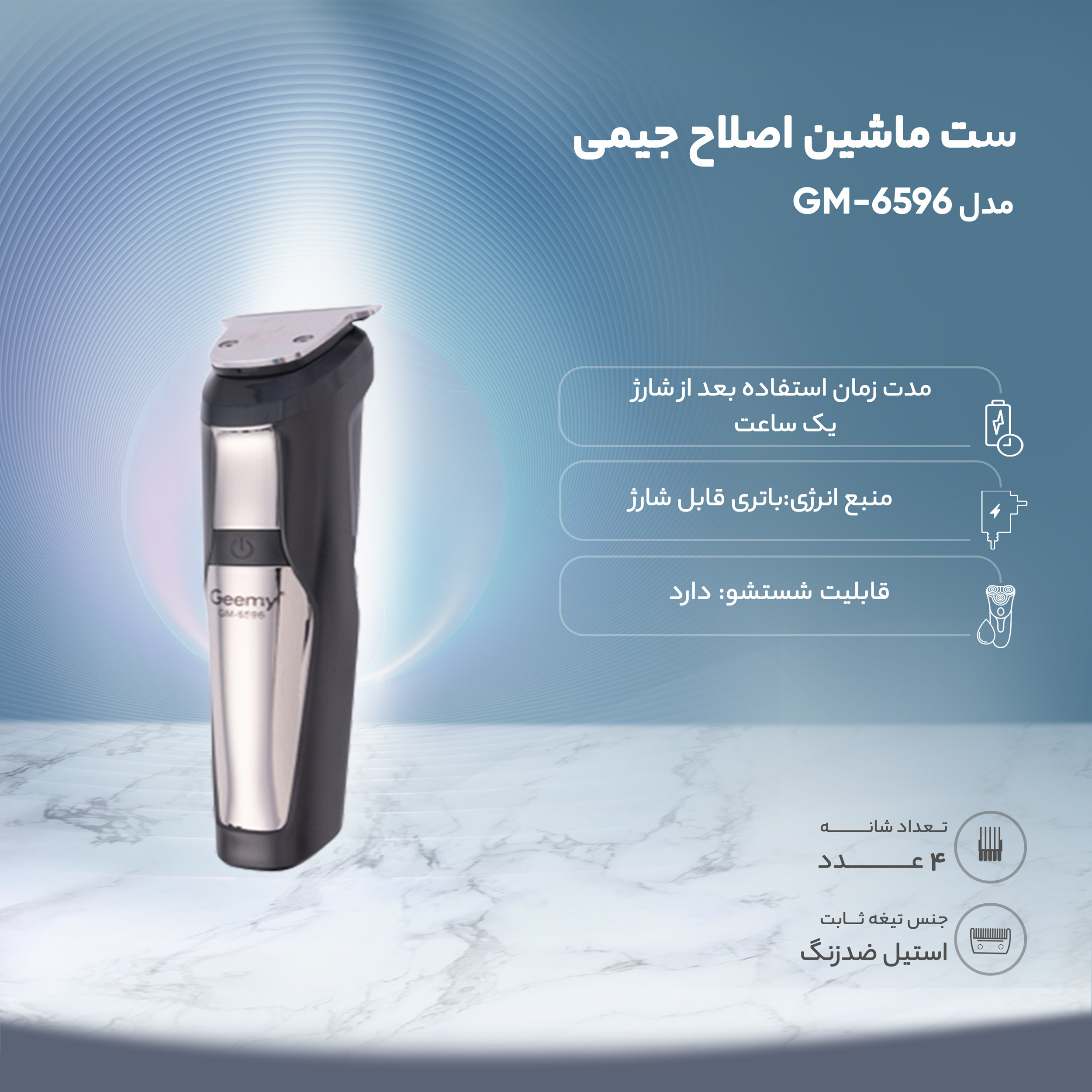 ست اصلاح جیمی مدل GM-6596 دستگاهی بسیار کاربردی و خوشساخت است که میتواند نیازهای مربوط به اصلاح آقایان را کاملا برطرف کند. این دستگاه با باتری قدرتمند میتواند برای آقایان گزینهای ایدهآل باشد. ست اصلاح جیمی مدل GM-6596 با 8 ابزار همراه برای اصلاح موهای تمام بدن طراحی شده و کاربر با داشتن این مدل میتواند تمام نیازهای مربوط به اصلاح خود را برطرف کند. بزرگترین مزیت این ست اصلاح فیلیپس تنوع سریها و شانههای آن است که امکان اصلاح تمام موهای بدن را فراهم کردهاند. این دستگاه در مجموع 8 سری و شانه دارد که هر کدام کاربرد خاص خودشان را دارند. سری تریمر بزرگ دستگاه برای اصلاح کردن موهای سر و صورت کاربرد دارد. همچنین یک سری کوچک تریمر هم برای نواحی محدود در نظر گرفته شده است. سری مخصوص گوش و بینی نیز امکان اصلاح کردن این نواحی را فراهم میکند. برای خط ریش نیز یک سری مخصوص در نظر گرفته است که باعث میشود آقایان بتوانند به سلیقهی خود اصلاح کنند. این مدل به 4 نیز مجهز است که برای اصلاح موهای سر و بدن کاربرد دارند. یکی دیگر از مزایای این دستگاه قابل شارژ بودن آن می باشد که مدت زمان لازم برای شارژ آن 6 ساعت می باشد و پس از آن می توان از آن 60 دقیقه بصورت مداوم استفاده کرد.