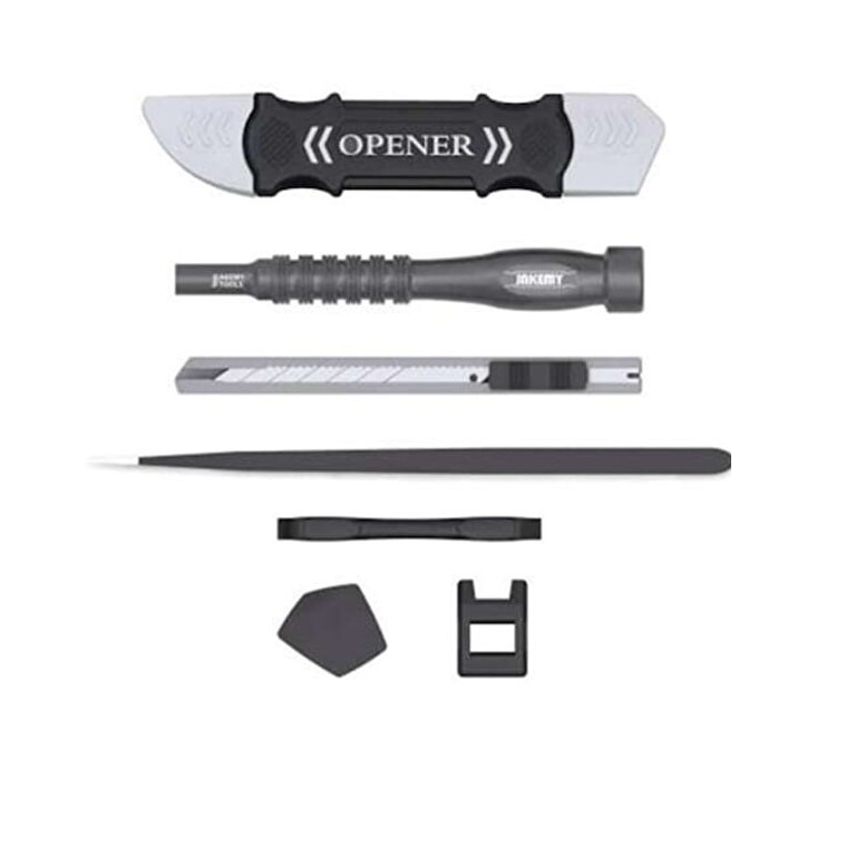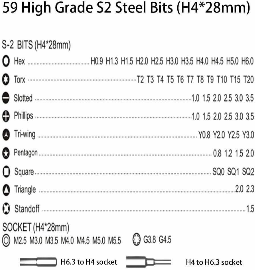 ● شامل: ● یک عدد قاب باز کن حرفه‌ای ● یک عدد پنس فلزی سرصاف ● یک عدد تیغ و کاتر ● دو عدد اسپاتول پلاستیکی زاویه دار ● یک عدد مگنت کننده سر پیچ‌گوشتی ● سه عدد پیک پلاستیکی ● یک عدد دسته پیچ گوشتی ● سری‌های پیچ‌گوشتی شامل: ● شش ضلعی: 0.9 ، 1.2 ، 1.5 ، 2.0 ، 2.5 ، 3.0 ، 3.5 ، 4.0 ، 4.5 ، 5.0 ،6.0 ● T2 ، T3 ، T4 ، T5 ، T6 ، T7 ، T8 ، T9 ، T10 ، T15 ، T20 ● دو سو: 1.0 ، 1.5 ، 2.0 ، 2.5 ، 3.0 ، 3.5 ●چهارسو: 1.0 ، 1.5 ،2.0 ، 2.5 ، 3.0 ، 3.5 ● سه‌پر: 2.0 ، 2.3 ● Yشکل: 0.8 ، 2.0 ، 2.5 ، 3.0 ● پنج‌ضلعی: 0.8 ، 1.2 ، 1.5 ، 2.0 ● SQ0 ، SQ1 ، SQ2 ● بوکس: M2.5 ، M3.0 ، M3.5 ، M4.0، M4.5 ، M5.0 ، M5.5 ، G3.8 ، G4.5