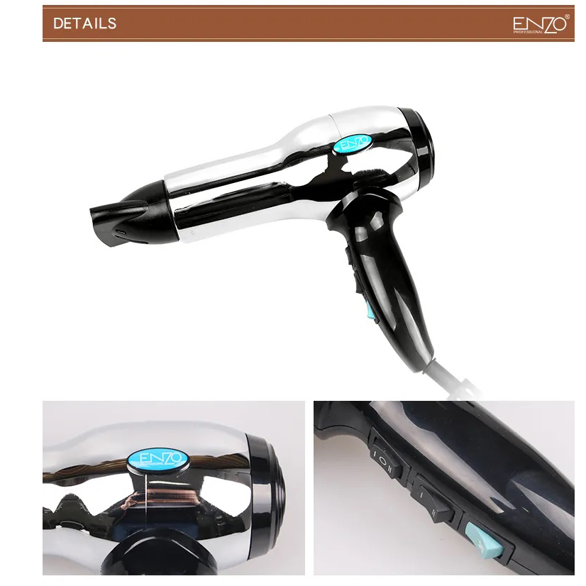 برای استفاده شخصی و سالن آرایشگری مناسب است. سشوار انزو با توان 6000 وات و موتور AC در سریعترین زمان موها رو خشک کرده و به آنها حالت می دهد، از وز شدن موها جلوگیری می کند. این سشوار دارای باد سرد و گرم بوده و همچنین قابلیت تنظیم سرعت تند و کند باد را دارد. این سشوار دارای فیلتر قابل جدا بوده که پس از مدتی استفاده از سشوار میتوان فیلتر را جدا کرده و آنرا تمیز کرد.