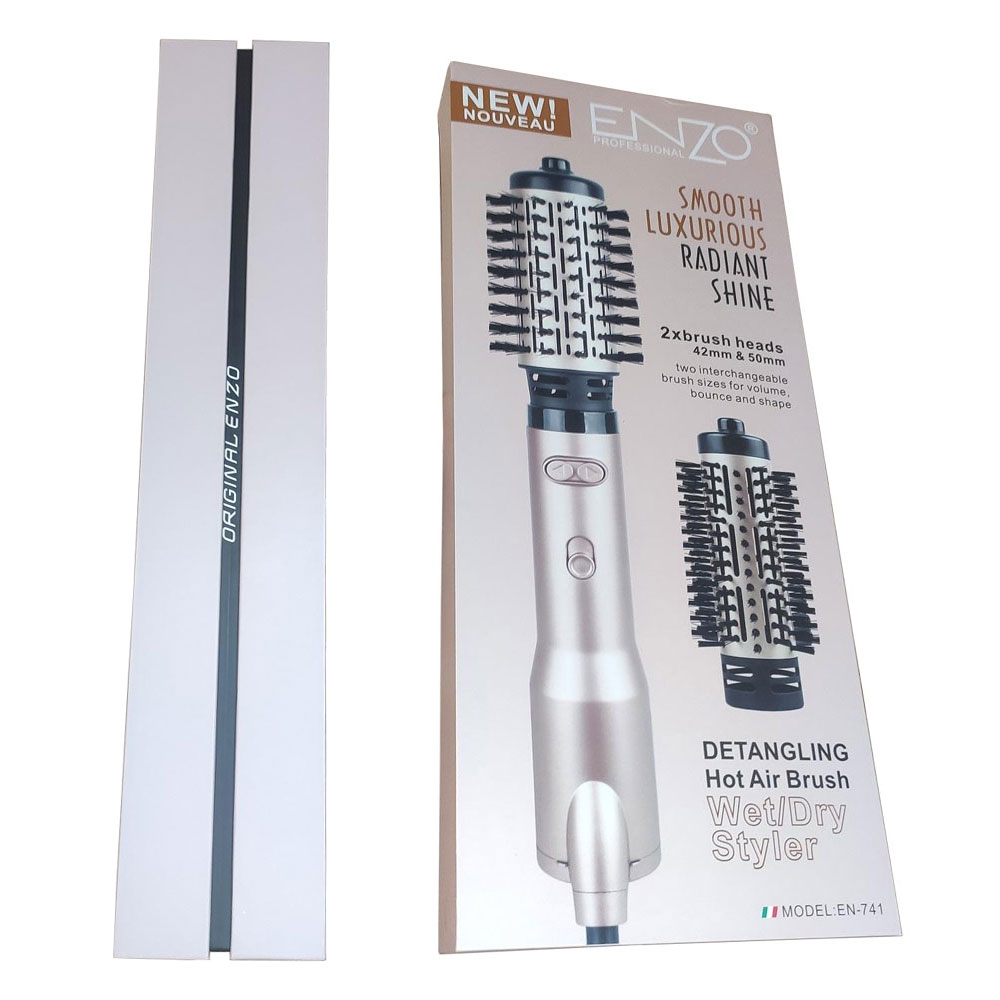 سشوار برس‌دار چرخشی حرفه‌ای انزو مدل EN 741، موتور AC با توان مصرفی 1500 وات، دارای نرم‌کننده‌ی یونی، قابلیت تعویض سری، با حالت صاف‌کننده و حجم‌دهنده، وزن 700 گرم، تنظیم حرارت 1 حالته و کنترل سرعت 1 حالته، به همراه 2 عدد سری برس ۴۲ و ۵۰ میلی‌متری