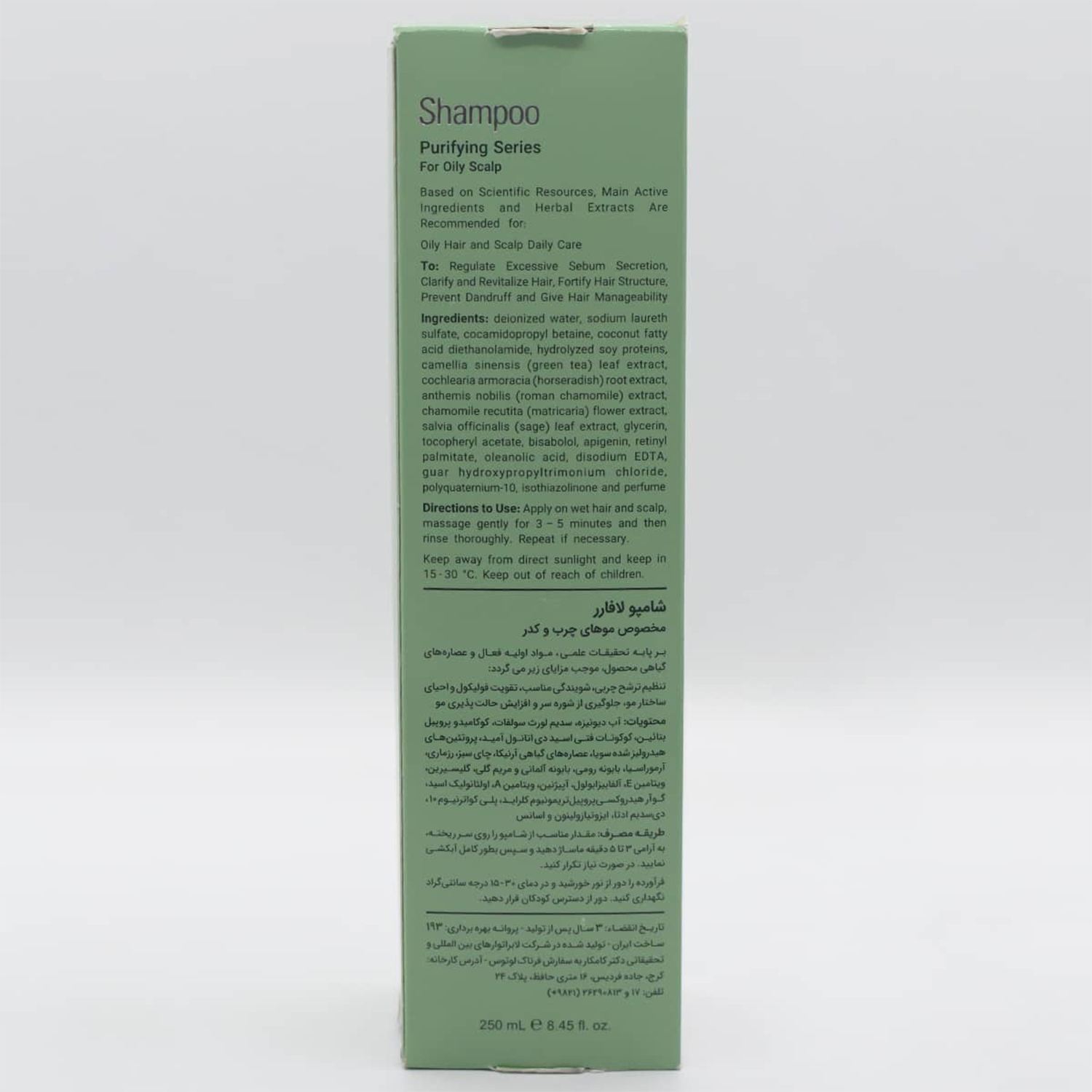 - سایر توضیحاتکنترل کننده ترشح غدد چربی پوست سر جلوگیری از ایجاد شوره و التهاب و خارش محافظ از مو در برابر عوامل آسیب رسان محیطی و شیمیایی شامپو لافارر برای موهای چرب موجب افزایش لطافت و درخشندگی موها افزایش قابلیت الاستیسیته مو و تقویت فولیکول مو افزایش دهنده گردش خون مویرگی و مغذی شامپو موی چرب لافارر دارای خاصیت آنتی اکسیدان به کمک عصاره چای سبز دارای خاصیت ترمیم کنندگی و رطوبت رسانی