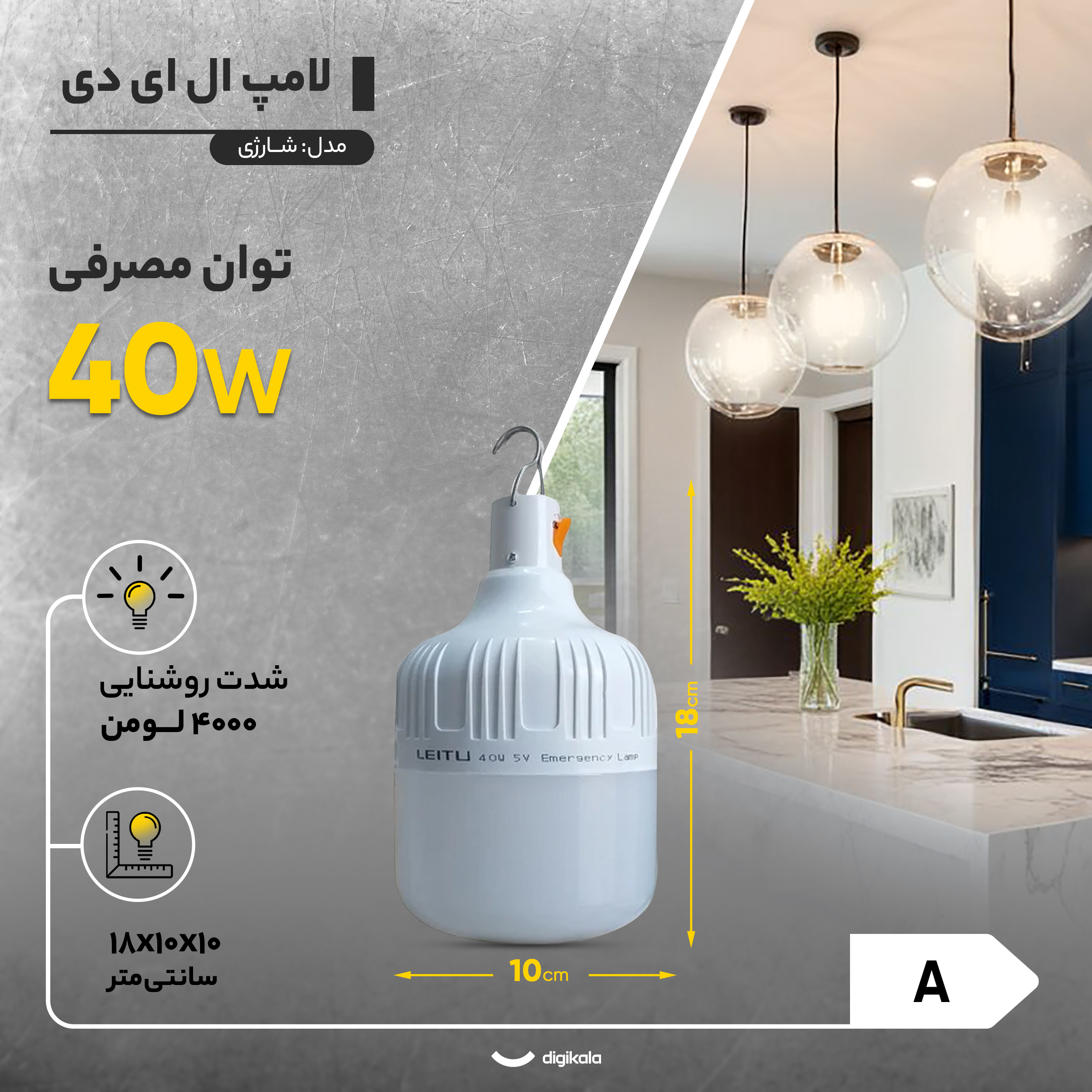 چراغ آویز ال ای دی شارژی مدل 40W که دارای 24 عدد چراغ LED کم مصرف بوده و قابلیت روشنایی طولانی مدت 8 ساعت را دارا است. این محصول شگفتانگیز 3 حالت مختلف روشنایی دارد که شامل حالت ثابت پر نور و ثابت کم نور و حالت چشمک زن یا رقص نور بوده و با وجود توان بالای خروجی، کم مصرف است. از ویژگیهای بسیار مهم این لامپ شارژی، میتوان به قابلیت حمل و نقل بسیار آسان آن به دلیل داشتن وزن کم و عمر بالای باتری آن اشاره کرد. در قسمت بالای این محصول، یک قلاب تعبیه شده است تا به آسانی به مکان دلخواهتان نصب شود. این محصول فوق العاده با روشن بودن مداوم اصلا گرم نمیشود و در زمان قطعی برق، بسیار کاربردی عمل میکند. در مواقع نیاز میتوانید این چراغ را به راحتی از طریق پاوربانک و یا شارژر دیواری شارژ کرده و حتی آن را از طریق شارژر فندکی ماشین نیز شارژ کنید و در همه حال به آسانی از آن استفاده کنید. داشتن نور کافی و عمر بالای آن در مواقع ضروری که دسترسی به برق ندارید این وسیله را به ابزاری مفید و ضروری برای شما تبدیل میکند.