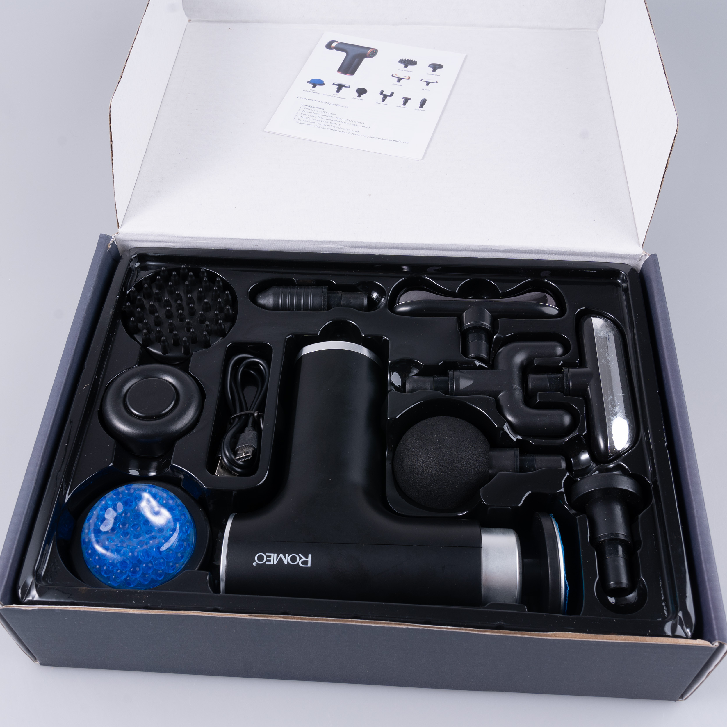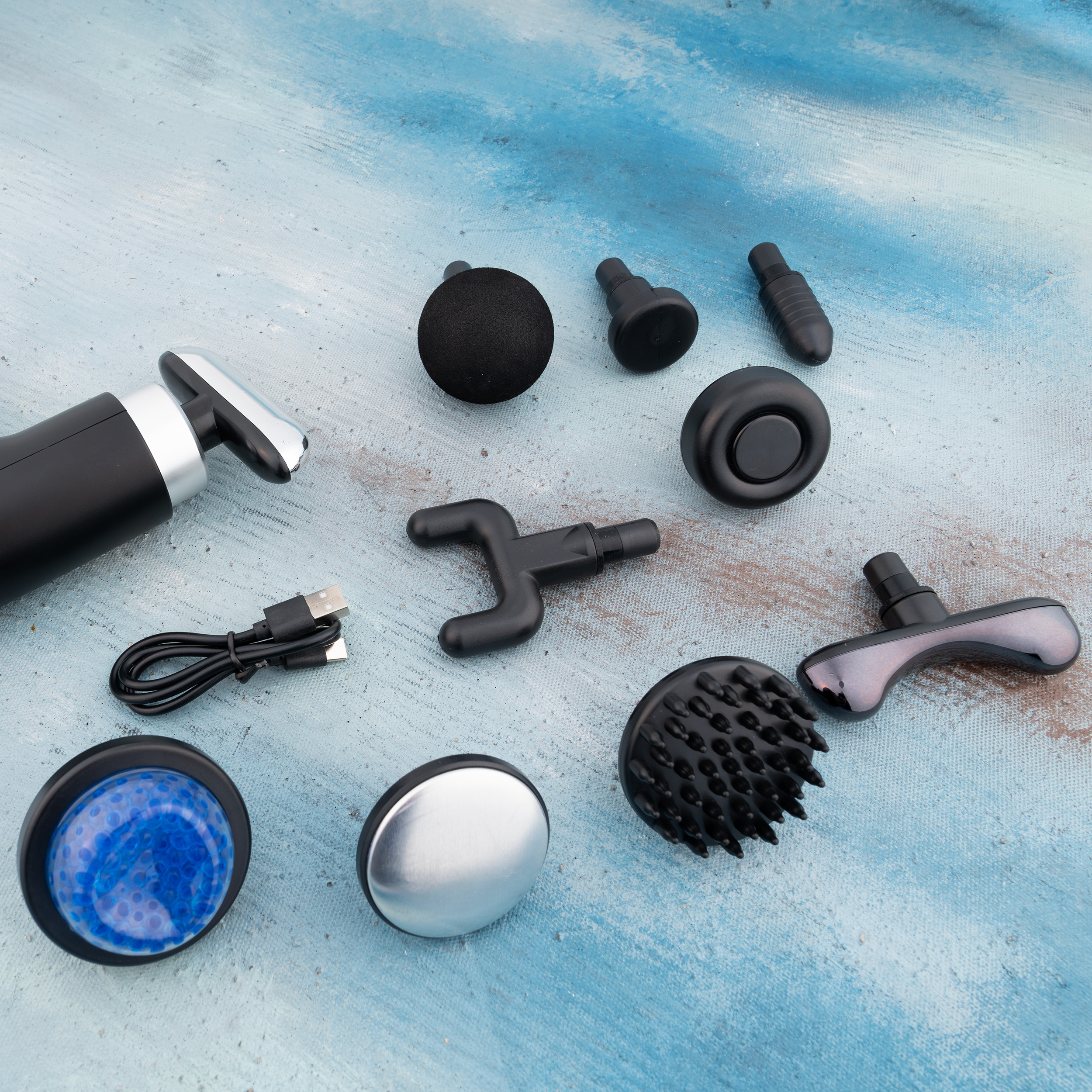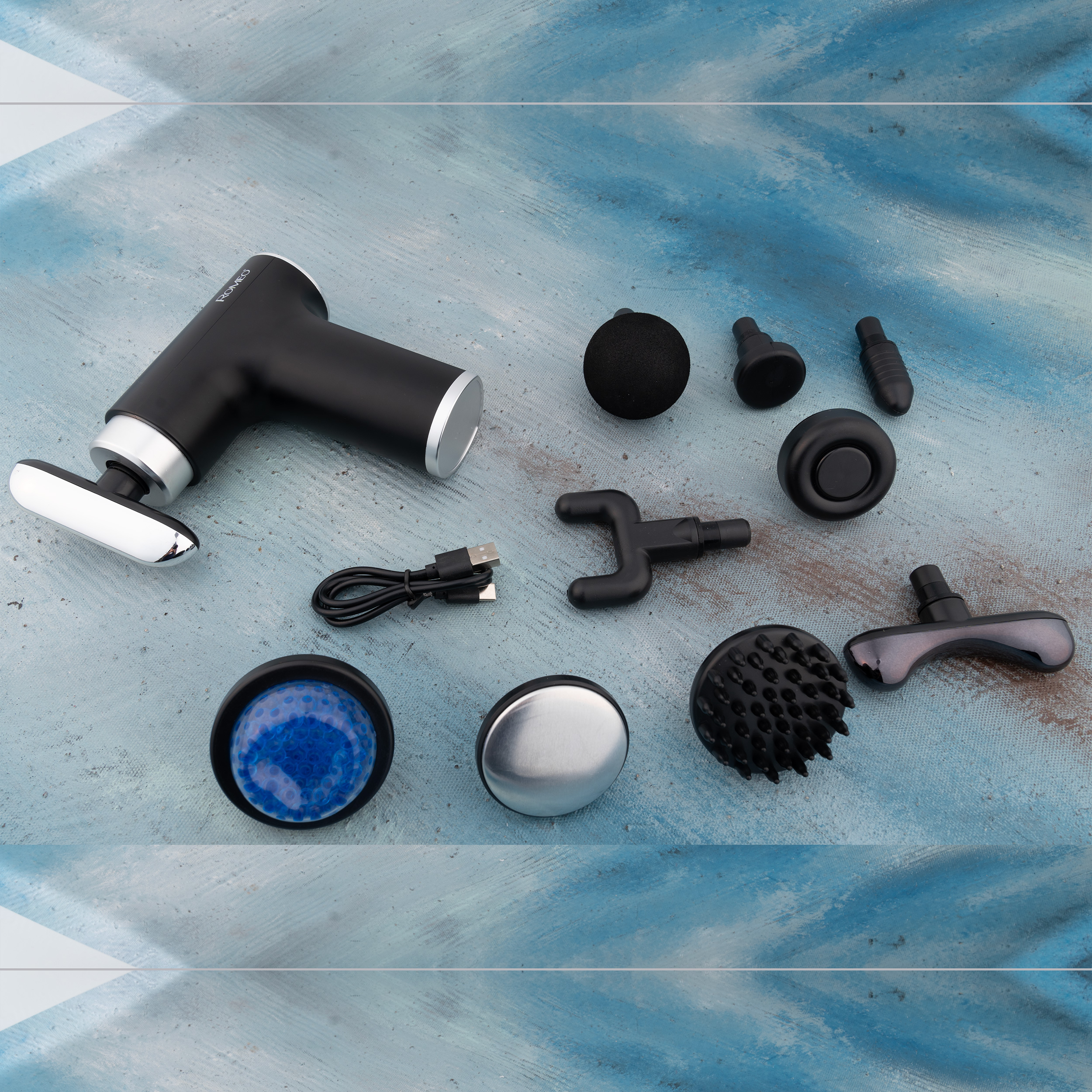 ۱۰ عدد سری قابل تعویض: برای ماساژ نقاط مختلف بدن، شامل: سری سوزنی درشت سری هلالی یو وی سری فاسیا یو وی سری دو دایره‌ای سری یوشکل سری گلوله‌ای سری‌های گرد و تخت کابل شارژر USB: برای شارژ راحت و سریع دستگاه در هر مکانی.