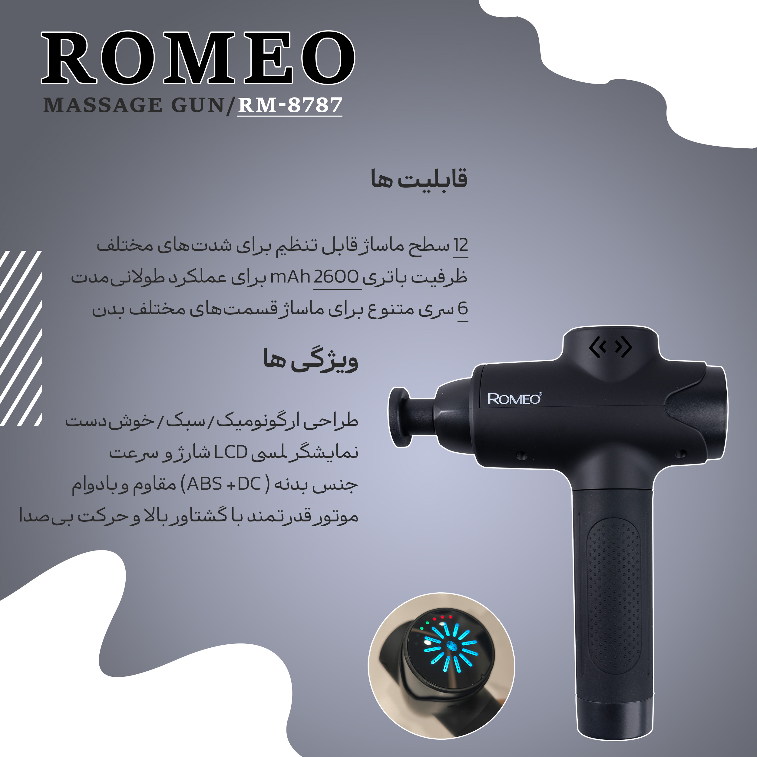 ماساژور رومئو مدل RM-8787 یک دستگاه پیشرفته و کارآمد است که به شما تجربه‌ای نو از آرامش و تسکین دردهای عضلانی را هدیه می‌دهد. با طراحی مدرن و ویژگی‌های منحصر به فرد خود، به‌ویژه برای افرادی که به دنبال تسکین دردهای ناشی از تمرینات شدید یا نشستن طولانی‌مدت هستند، انتخابی ایده‌آل محسوب می‌شود.
