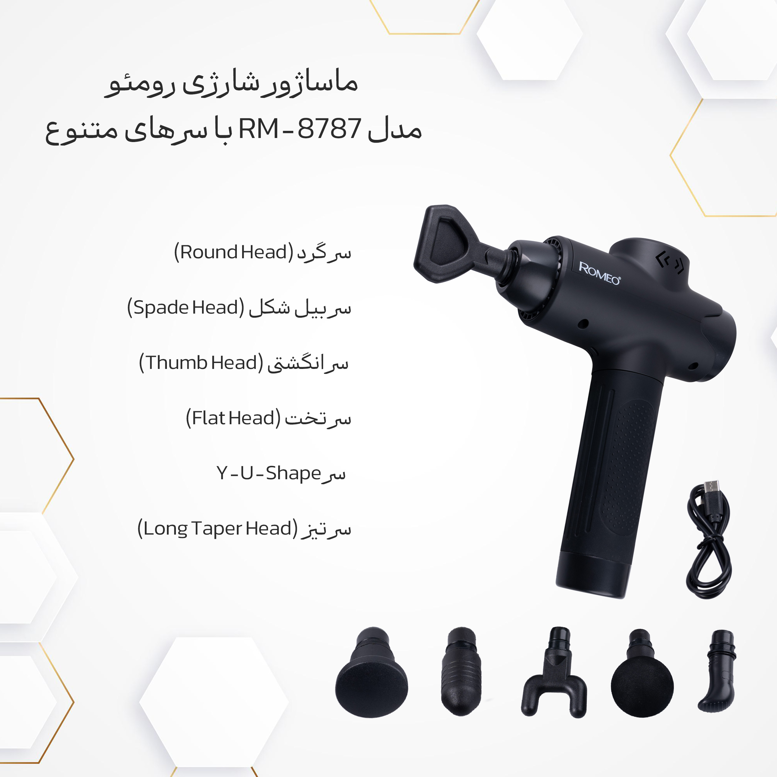 از دیگر ویژگی‌ ها، طراحی ارگونومیک و استفاده از مواد مقاوم مانند پلی‌کربنات و ABS است که به آن دوام و سبکی می‌بخشد. این مواد در عین مقاوم بودن، راحتی استفاده از دستگاه را تضمین می‌کنند. ماساژور RM-8787 با سری‌های مختلف خود به راحتی می‌تواند نیازهای متفاوت شما را برطرف کند. سر گرد برای ماساژ عضلات بزرگ مانند پشت و کمر طراحی شده و به کاهش درد مفاصل کمک می‌کند. سر بیل شکل برای افزایش انعطاف‌پذیری عضلات ران و باسن مناسب است و سر انگشتی به کاهش درد مچ‌ها و ساعد کمک می‌کند. سر تخت برای ماساژ کلی بدن و تسکین عضلات است و سر Y-U-Shape برای کاهش سفتی گردن و شانه‌ها ایده‌آل است. علاوه بر این، سر Long Taper برای ماساژ بافت‌های عمقی و تسکین دردهای عضلانی بسیار مؤثر است.