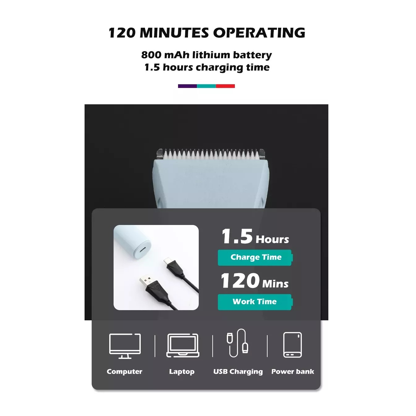ضد آب دارای باتری قدرتمند داخلی 800 میلی آمپر دارای سه سری قابل تعویض برای اصلاح حرفه ای و سوهان کاری ناخن ها قابلیت شارژ سریع دارای دو حالت اصلاح نرمال و حالت توربو برای موهای پرپشت دارای شانه ایمن بر روی تیغه ی سری کم عرض برای جلوگیری از زخمی شدن قسمتهای حساس بدن