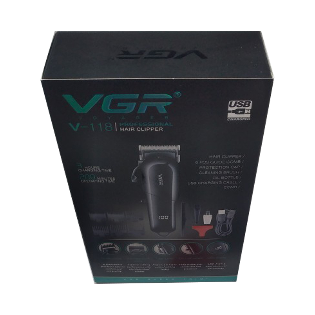 ماشین اصلاح وی جی ار مدل 118 یکی از ماشین های اصلاح بسیار عالی و با کیفیت برای استفاده خانگی و یا حتی سالن میباشد. این مدل دارای طراحی زیبا و خوش دستی است که از استفاده از ان خسته نمیشوید. این دستگاه دارای باتری لیتیومی قدرتمند 2000 میلی امپر است که امکان استفاده 200 دقیقه ای را برای شما فراهم میکند و مدت زمان شارژ ان 3 ساعت است. روی این مدل یک نمایشگر LED تعبیه شده که میزان شارژ باتری را نشان میدهد. دارای 6 عدد شانه 13-10-6-4.5-3-1.5- میلی متری.. برس تمیز کننده.. روغن.. کابل شارژ USB و یک شانه همراه میباشد.