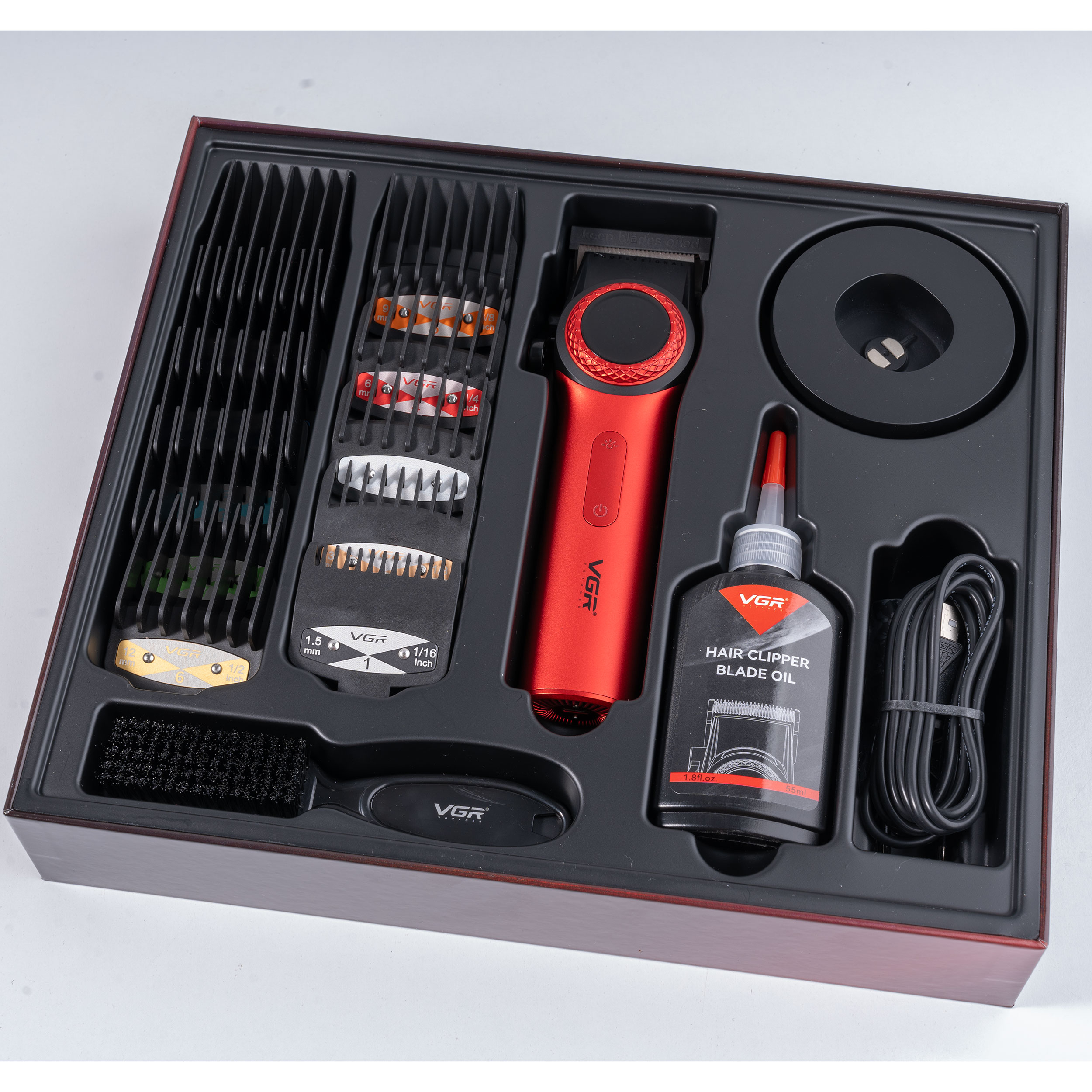 برس تمیز کننده/روغن روان کننده/استند شارژر/آداپتور/ کابل سارژ تایپ سی/ 10 شانه با سایز 1.5، 3، 4.5، 6، 9، 12، 15، 18، 21 و 24 میلی متر