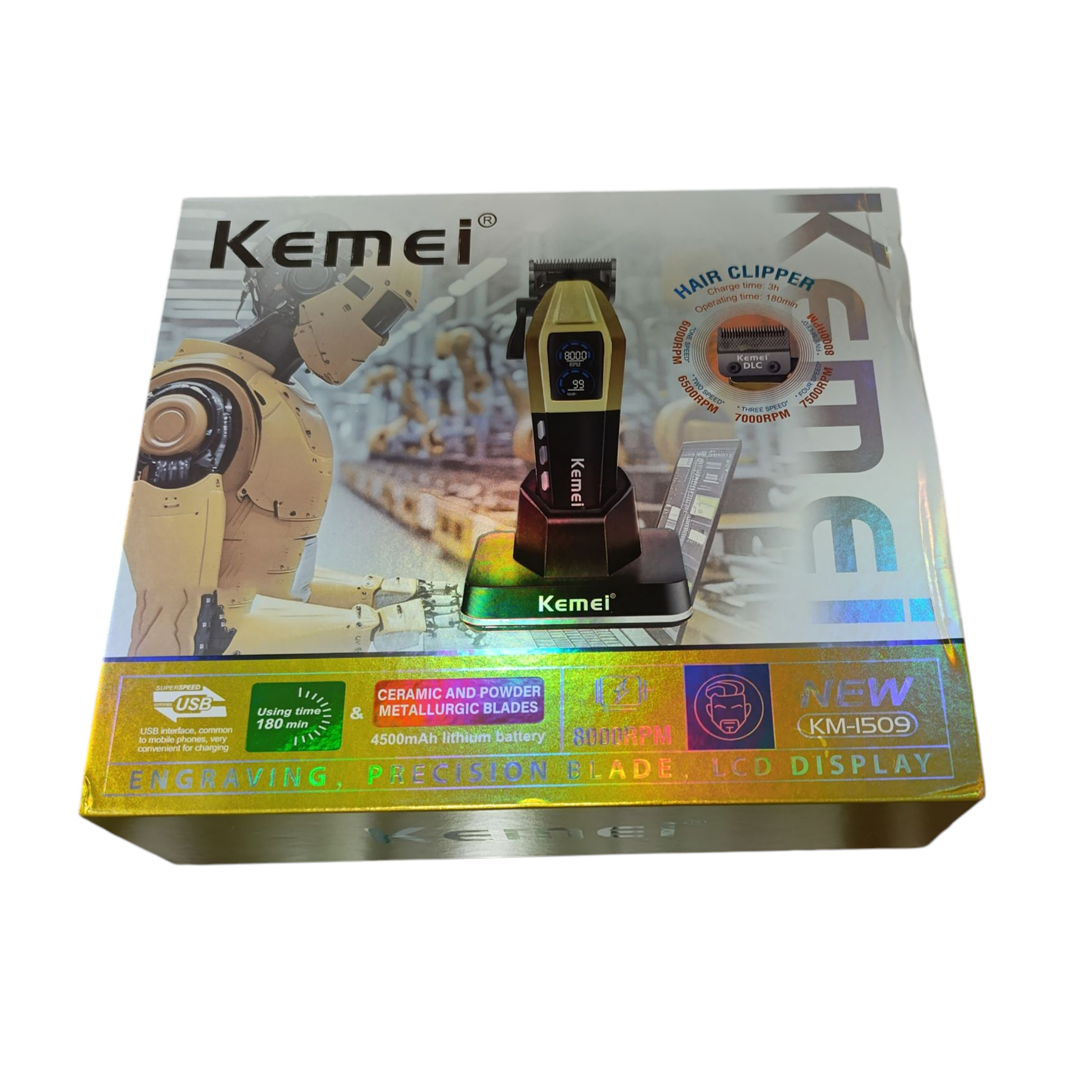 - سایر مشخصاتحجم زن کیمی 1509 ، مدت زمان قابل شارژ و شارژدهی : 3 ساعت ، دارای 5 سرعت مجزا(6000-6500-7000-7500-8000) ، تیغه های سرامیکی و متالوژی پودری ، باتری لیتیومی 4500 میلی آمپر ، ماشین اصلاح موی DC و قابل شارژ ، دارای نمایشگر LCD ، موتور FF 2838 ، دارای ۸ شانه محدود (۱.۵ میلیمتر/۳ میلیمتر/۴.۵ میلیمتر/۶ میلیمتر/۹میلی متر /۱۲ میلیمتر/۱۶ میلیمتر/۱۹ میلیمتر) ، ولتاژ کارکرد: 3.7 ولت مستقیم ، تیغه های خود تیز شونده ، قدرت 10وات ، قابل شارژ با آداپتور 5ولت 2آمپر