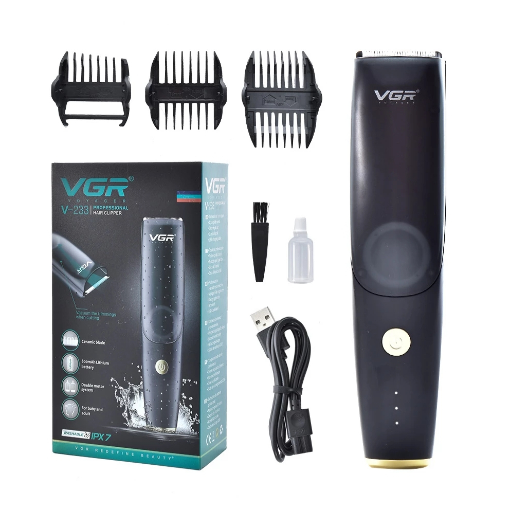 ماشین اصلاح وکیوم دار ( مکش مو ) وی جی ار مدل 233 مخصوص اصلاح مو سر ، صورت و بدن میباشد این دستگاه کاملا ضد آب و 2 سرعته و دارای محفظه ای است که موقع اصلاح مو رو داخل آن محفظه جمع میکنه و باعث میشه هیچ مویی نه رو لباس و نه اطراف پخش بشه و محفظه آن به راحتی باز میشود که راحت مو رو خالی کنیم . باطری این دستگاه لیتیوم یون ( سریع شارژ ) و با 2 ساعت شارژ 100 دقیقه کارکرد دارد . جنس تیغه های این دستگاه سرامیک است و هیچ گونه حساسیتی برای شما ایجاد نمیکند اصلاح روان و لذت بخش را برای شما فراهم میکند .