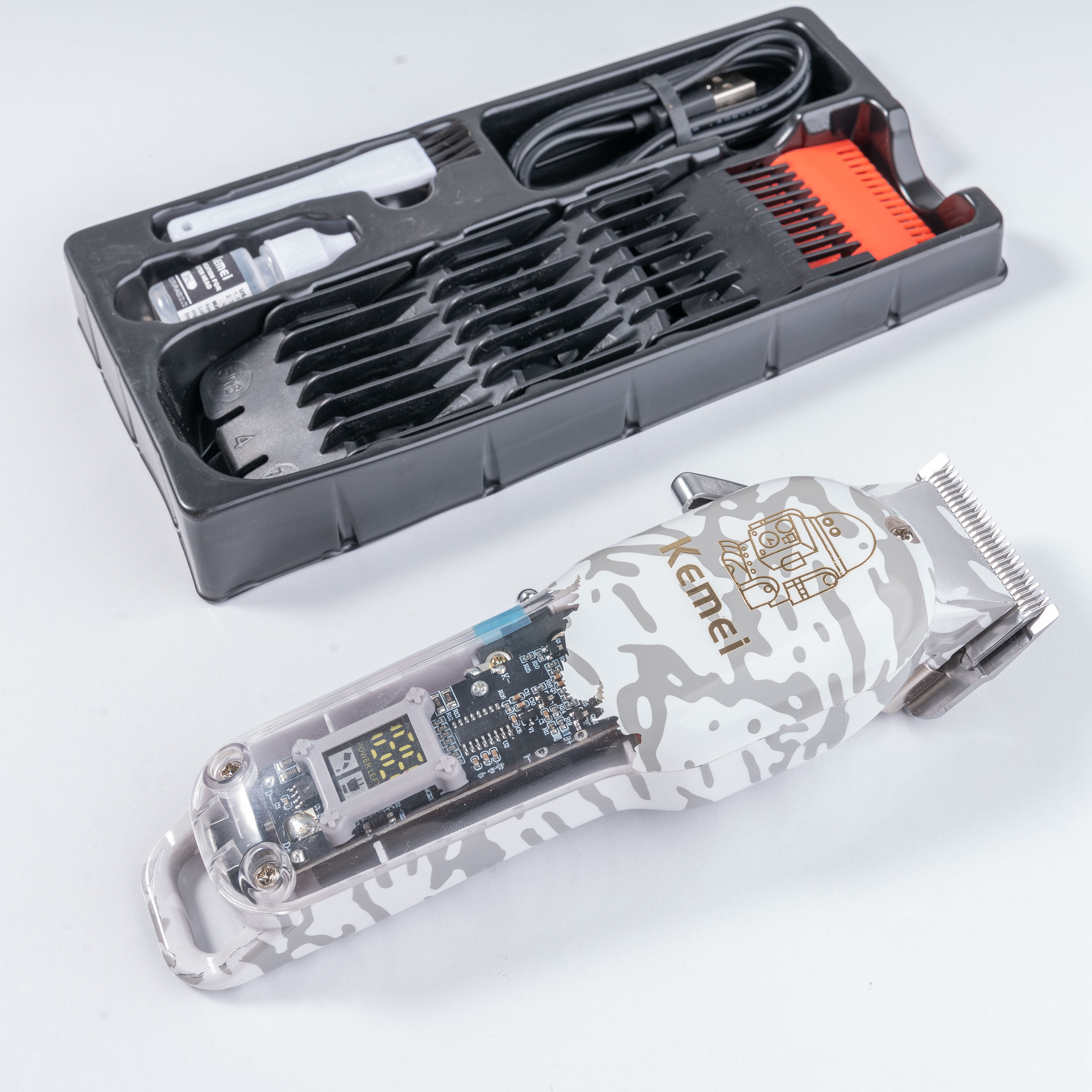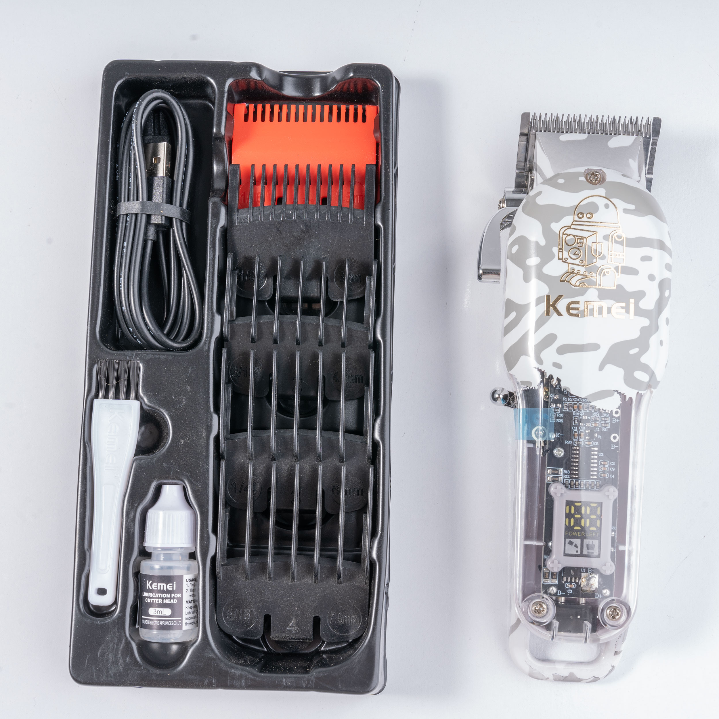5 عدد شانه با سایز های 1.5، 3، 4.5، 6، 7.5 میلیمتر/ کابل شارژر/ برس تمیز کننده/ روغن روان کننده