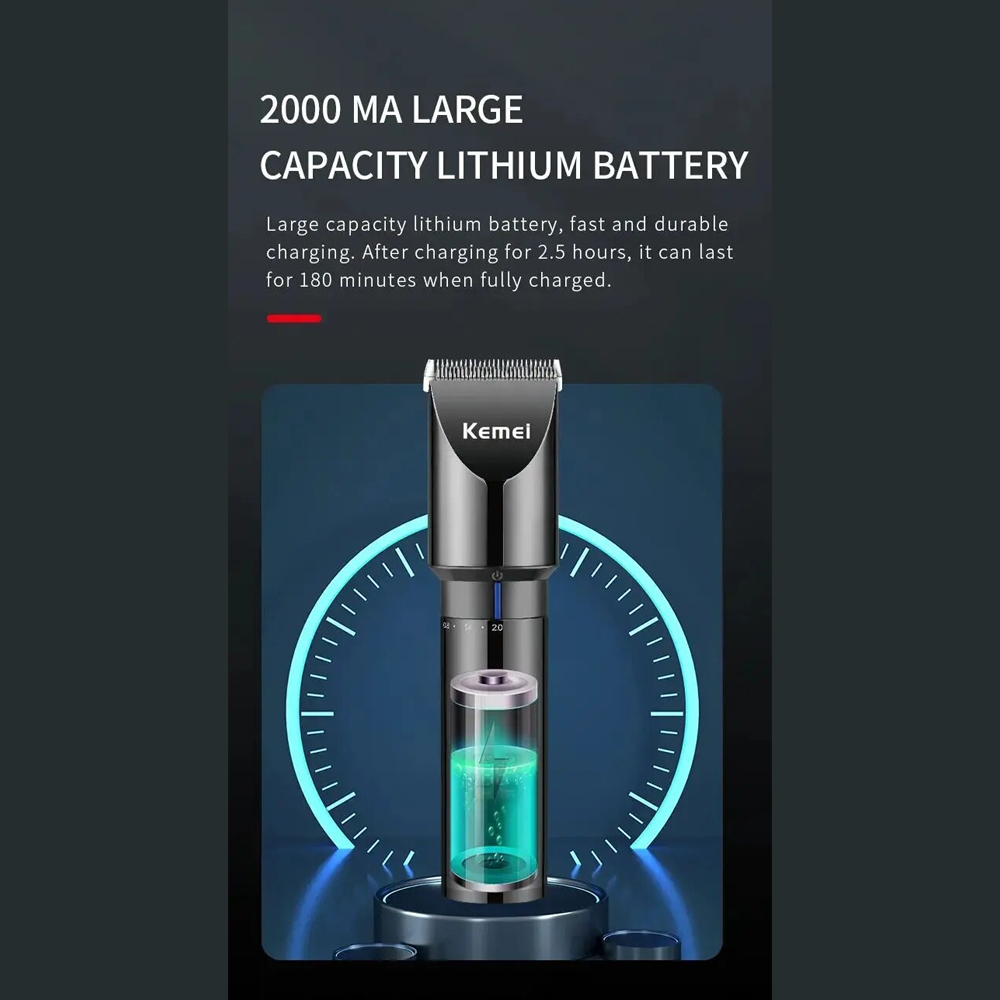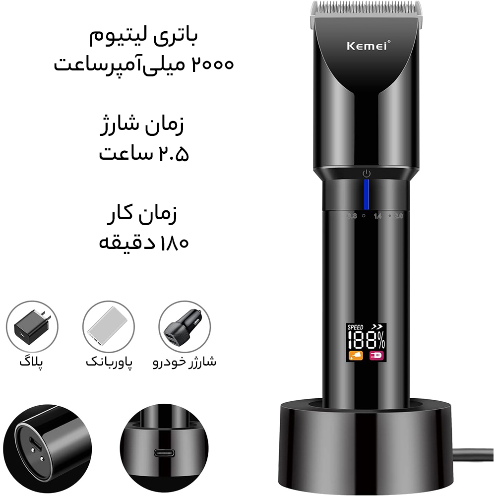 ماشین اصلاح KM-3293 با تکنولوژی به روز و جدید یکی از محصولات مطرح این برند می باشد. طراحی ارگونومیک و دارا بودن پایه شارژ یکی از نقاط قوت آن است. توان این ماشین اصلاح 5 وات بوده و باتری لیتیومی 2000 میلی آمپری قابلیت استفاده تا 3 ساعت را دارد.