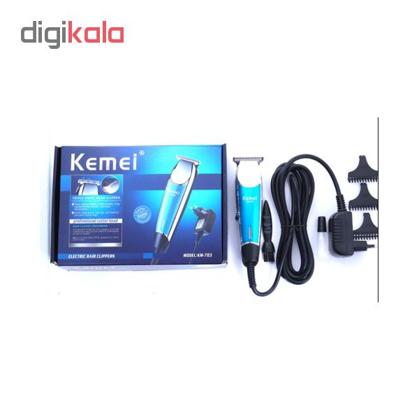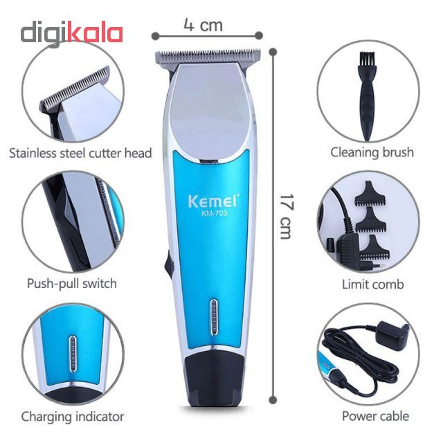 همه ی آقایان دوست دارند که صورتی بدون مو و مرتب داشته باشند برای همین امر هم باید روزانه به اصلاح سر و صورت خود بپردازند. با استفاده از ماشین اصلاح پر قدرت و صفر زن می توان تا چند روز سر و صورت بدون مو داشته باشید. ماشین اصلاح کیمی مدل KM-703 یکی از بهترین ماشین های شرکت کیمی می باشد که می توان از آن در خانه و آرایشگاه استفاده کرد. ماشین اصلاح مدل KM-703 دارای تیغه هایی از جنس استیل ضد زنگ می باشد که در مقابل هوا و رطوبت از مقاومت خیلی بالایی برخوردار است. تکنولوژی برش این ماشین اصلاح بصورت مستقیم می باشد که موها را با مرزبندی مشخصی برای شما اصلاح می کند. به همراه این ماشین اصلاح 3عدد شانه ارایه شده است که از طریق آن ها می توان موهای سر و صورت تا 0 میلی متر اصلاح و مرتب کرد.برق مستقیم می تواند نقطه قوتی برای این دستگاه باشد چراکه می توان در آرایشگاه همیشه دستگاهی قدرتمند داشته باشید. به همراه ماشین اصلاح کیمی مدل KM-703 برس و روغن ارایه شده است تا شما بعد از هر بار اصلاح تیغه های آن را به خوبی تمیز و مرتب کرد. بجز سری اصلی دو عدد سری به همراه این ماشین اصلاح قرار داده شده است که از آن ها می توان برای خط ریش و سبیل و خط گردن و سایه زدن استفاده کرد.