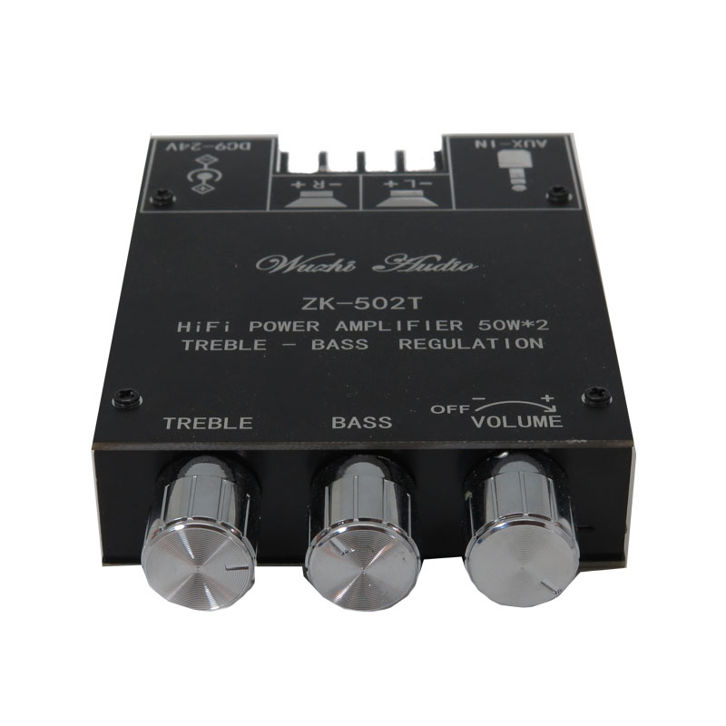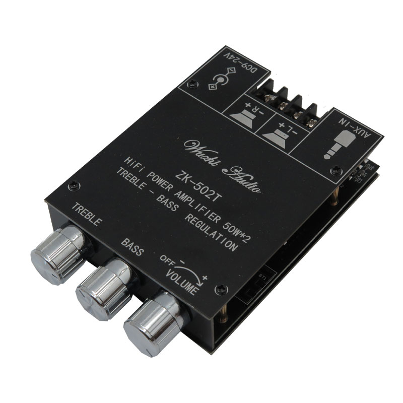 ماژول آمپلی فایر 50W ZK-502T یک ماژول تقویت کننده صوتی با گیرنده بلوتوثی است. این ماژول آمپلی فایر دارای 2 کانال خروجی با توان 50 وات RMS (2 کانال استریو یا 4 ترمینال اسپیکر) بوده و میزان مصرف برق آن بین 12 تا 24 ولت DC می باشد. با استفاده از چیپ بلوتوث که دارای نسخه 5 بلوتوث بوده و قابلیت اتصال مناسب نرم افزاری دارد، شما می توانید صوت ارسالی خود را توسط این برد یا ماژول، با کیفیت بسیار عالی پخش نمایید. این ماژول آمپلی فایر به غیر از بلوتوث ورودی AUX نیز دارد.
