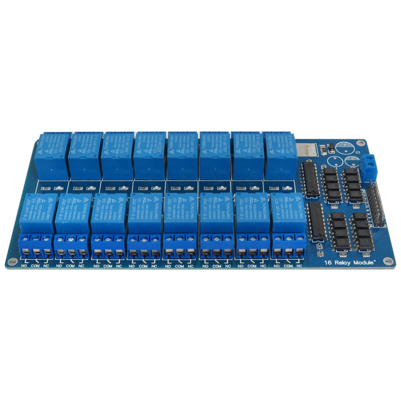 ماژول رله 5 ولت دارای 16 کانال میباشد که هر کدام از کانالها دارای جریان درایو 50-60 میلی آمپر است. همچنین مجهز به رله با جریان بالا AC250V 10A، DC30V 10A می باشد و دارای رابط استاندارد است که می تواند به طور مستقیم توسط میکروکنترلر کنترل شود (برای آردوینو، 8051, AVR, PIC, DSP, ARM, ARM, MSP430, TTL logic). همچنین این ماژول دارای نشانگرهای LED برای نشان دادن وضعیت خروجی رله می باشد.