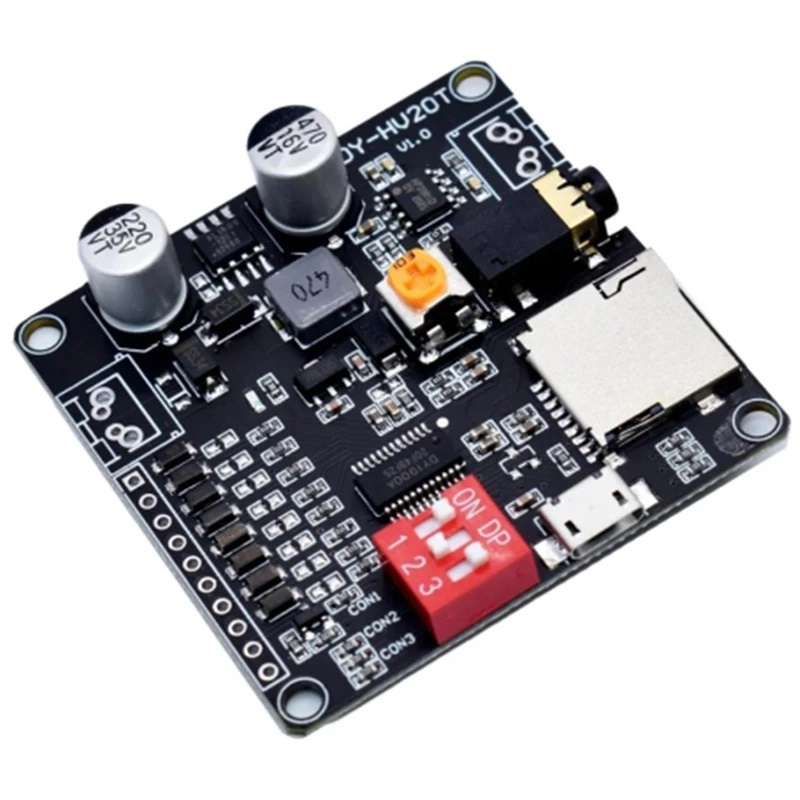 ماژول پخش صدا DY-HV20T در واقع یک ماژول صوتی هوشمند می باشد که دارای پورت سریال می باشد علاوه بر این ، این ماژول یک تقویت کننده 20 واتی کلاس D می باشد که می تواند مستقیماً بلندگو 4 اهم ، 20 وات و یا بلندگو 8 اهم ، 10 وات را درایو کند. این ماژول فرمت های صوتی MP3 و WAV پشتیبانی می کند ، همچنین می توان بر روی این ماژول از کارت حافظه (TF card) تا حداکثر تا 32Gbit نیز استفاده کرد علاوه بر آن قابلیت اتصال با کابل usb برای آپدیت اطلاعات کارت حافظه را دارا می باشد . این ماژول از یک خروجی صوتی جک 3.5 میلی متری نیز بهره می گیرد.