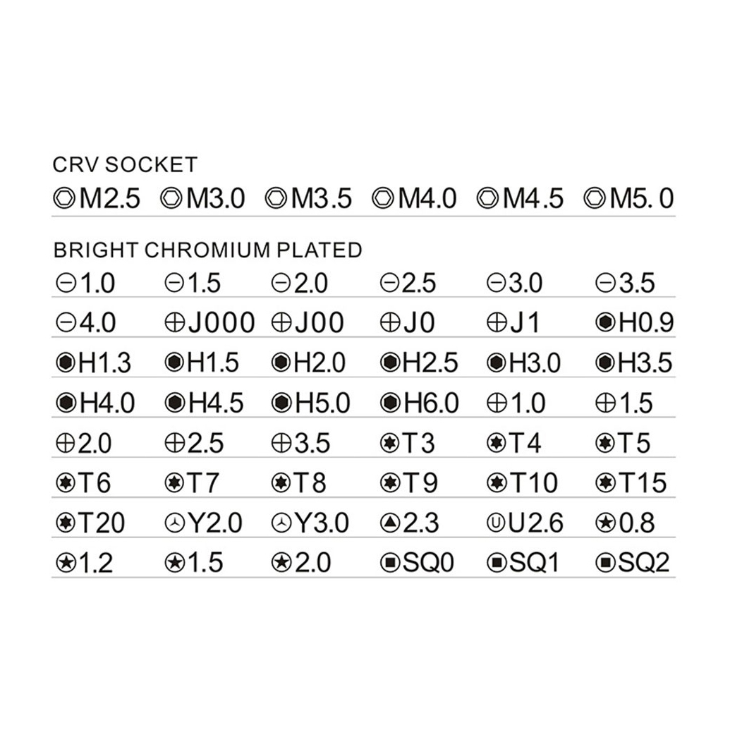 6 عدد سوکت شش گوشه داخلی M2.5 / M3.0 / M3.5 / M4.0 / M4.5 / M5.0 اسلاتها: 1.0 / 1.5 / 2.0 / 2.5 / 3.0 / 3.5 / 4.0 فیلیپس: 1.0 / 1.5 / 2.0 / 2.5 / 3.5 Torx: t3 / T4 / T5 / T6 / T7 / T8 / T9 / T10 / T15 / T20 هگز: h0.9 / H1.3 / H1.5 / H2.0 / H2.5 / H3.0 / H3.5 / H4.0 / H4.5 / H5.0 / h6.0 اندازه های JIS 000 ، 00 ، 0 ، 1 مثلث: 2.3 سه خط: Y2.0 / Y3.0 پنتاوب (ستاره): 0.8 / 1.2 / 1.5 SQ: 0/1/2 U شکل: U2.6 بسته شامل: قطعه پسوند 1 عدد (H4 x 60mm) کانکتور مرمر 1 عیار (H6 x 28mm) سوکت CRV 1 عیار (4 x 28 میلی متر)