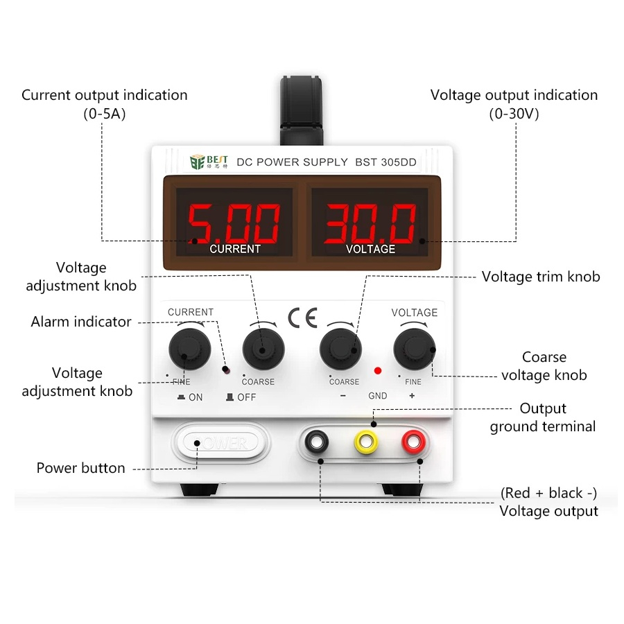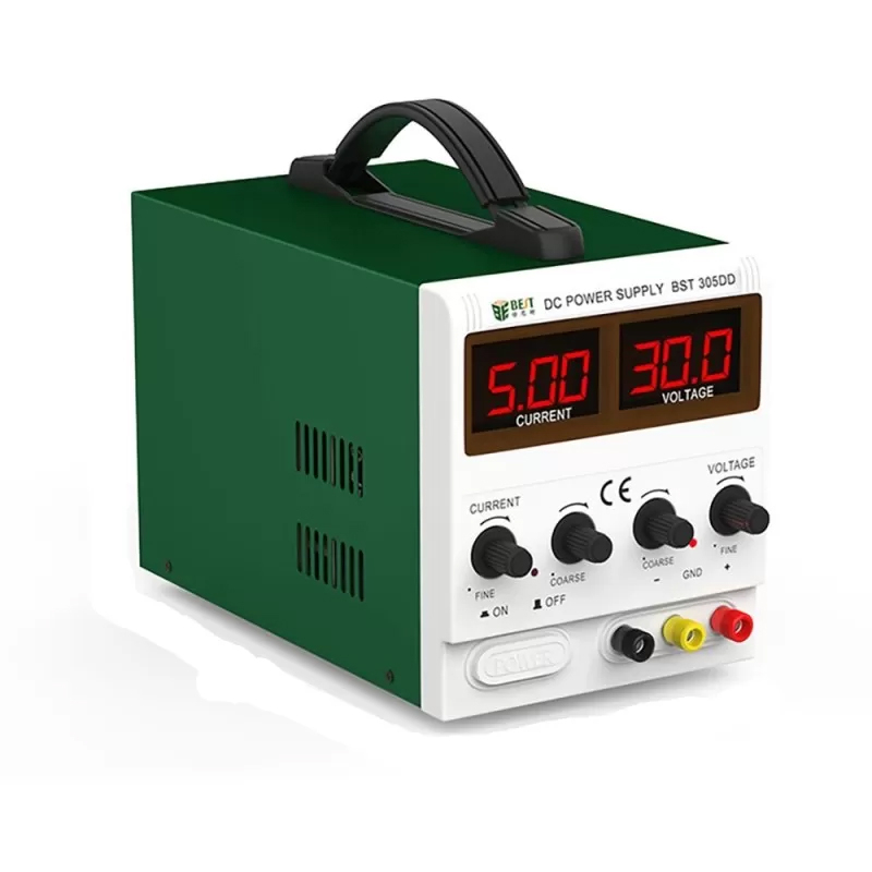 - سایر توضیحاتولتاژ خروجی: 0 تا 30 ولت DC جریان خروجی: 0 تا 5 آمپر نمایشگر: دو نمایشگر دیجیتال (ولتاژ و جریان) حفاظت: محافظت در برابر اتصال کوتاه و اضافهبار بدنه: فلزی با عایق الکتریکی ورودی: برق شهری 220 ولت یا 110 ولت قابلیتها: تنظیم دقیق ولتاژ و جریان با ولومهای مجزا وزن: حدود 4.5 کیلوگرم ابعاد: 260x155x125 میلیمتر