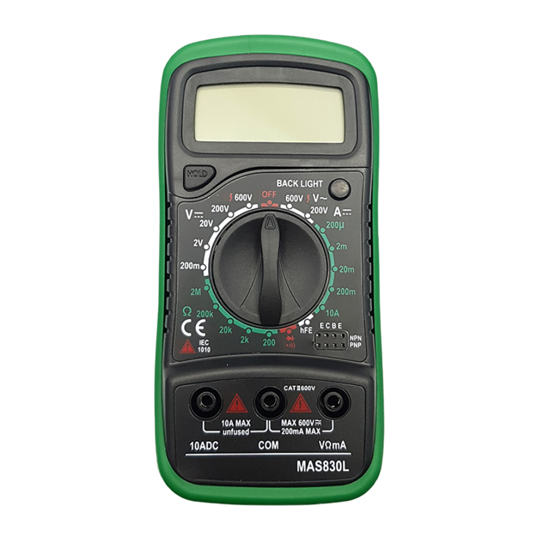 مولتی مترها برای سنجش کمیت های الکتریکی مانند ولتاژ، جریان،مقاومت الکتریکی و بهره ترانزیستور و …. به کار برده می شوند.دستگاه مولتی متر فوق ، از دقت مناسبی برخوردار است . مولتی متر مدل MAS830L دارای امکان سنجش مقاومت تا 2 مگااهم است همچنین جریان DC را در محدوده نسبتا" وسیعی ، از محدوده میکرو آمپر تا 10 آمپر با دقت مناسبی اندازه می گیرد و سنجش ولتاژ DC و AC با دقت خیلی خوب صورت می گیرد .دستگاه دکمه Hold که برای تثبیت مقدار نمایش داده شده ، جهت ثبت و یادداشت آن است ، دارد و همچنین برای جریان 10 آمپر باید پروب را در سوکت مشخص شده بر روی دستگاه قرار داد .سنجش اتصال کوتاه با صدا نیز از دیگر امکانات این مولتی متر می باشد. دستگاه نور پس زمینه آبی رنگ زیبایی دارد که با یک دکمه می توان آن را کنترل کرد.