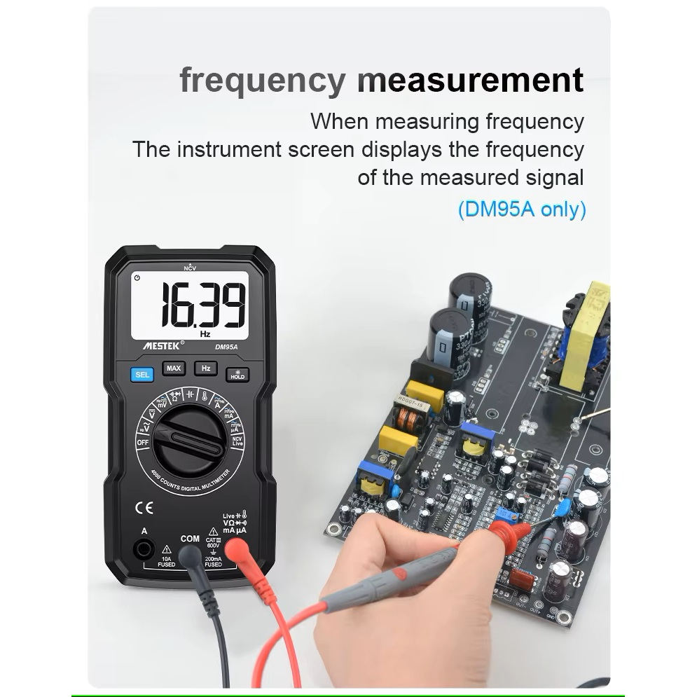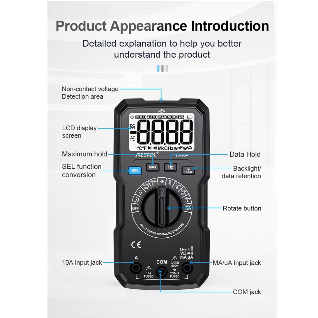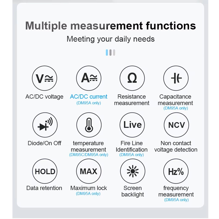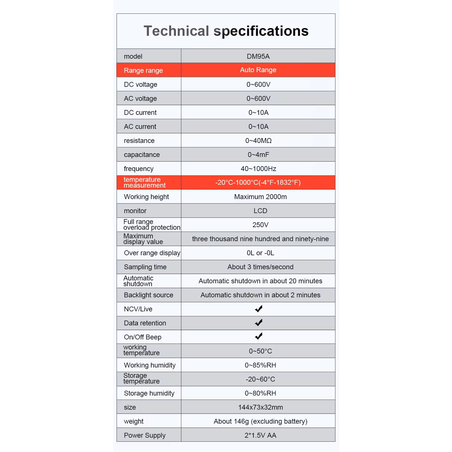 - سایر توضیحاتاندازه گیری ولتاژ AC/DC، جریان AC/DC، مقاومت، ظرفیت خازن، تست زنگ تداوم با LCD ، نگهداشتن دادهها ، تست دیود، دما ، فرکانس، تست NCV ، خاموش شدن خودکار: حدود ۱۵ دقیقه ، ، چراغ قوه LED داخلی، مناسب برای استفاده در شب یا محیط تاریک