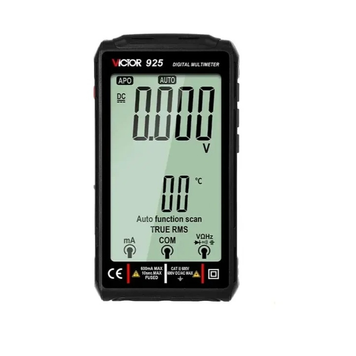 - سایر توضیحاتAC Voltage: 10V/100V/ 600V AC Current: 60mA /600mA DC Voltage: 10V/100V/ 600V DC Current: 60mA /600mA محدوده اندازه گیری ظرفیت خازنی: 100nF 1000nF 10uF/100uF/100OuF/1mF 10mF /100mF محدوده اندازه گیری مقاومت: 100Ω /1000Ω /10kΩ/100kΩ/1MΩ /10MΩ /20MΩ صفحه نمایشگر LCD لمسی با حساسیت بالا تست NCV تست دیود دارای قابلیت اتو رنج تغذیه: باتری لیتیومی 3.7V 500mA دارای نور صفحه نمایش (backlight) دارای 2 فیوز محافظ از دستگاه در برابر فشار احتمالی