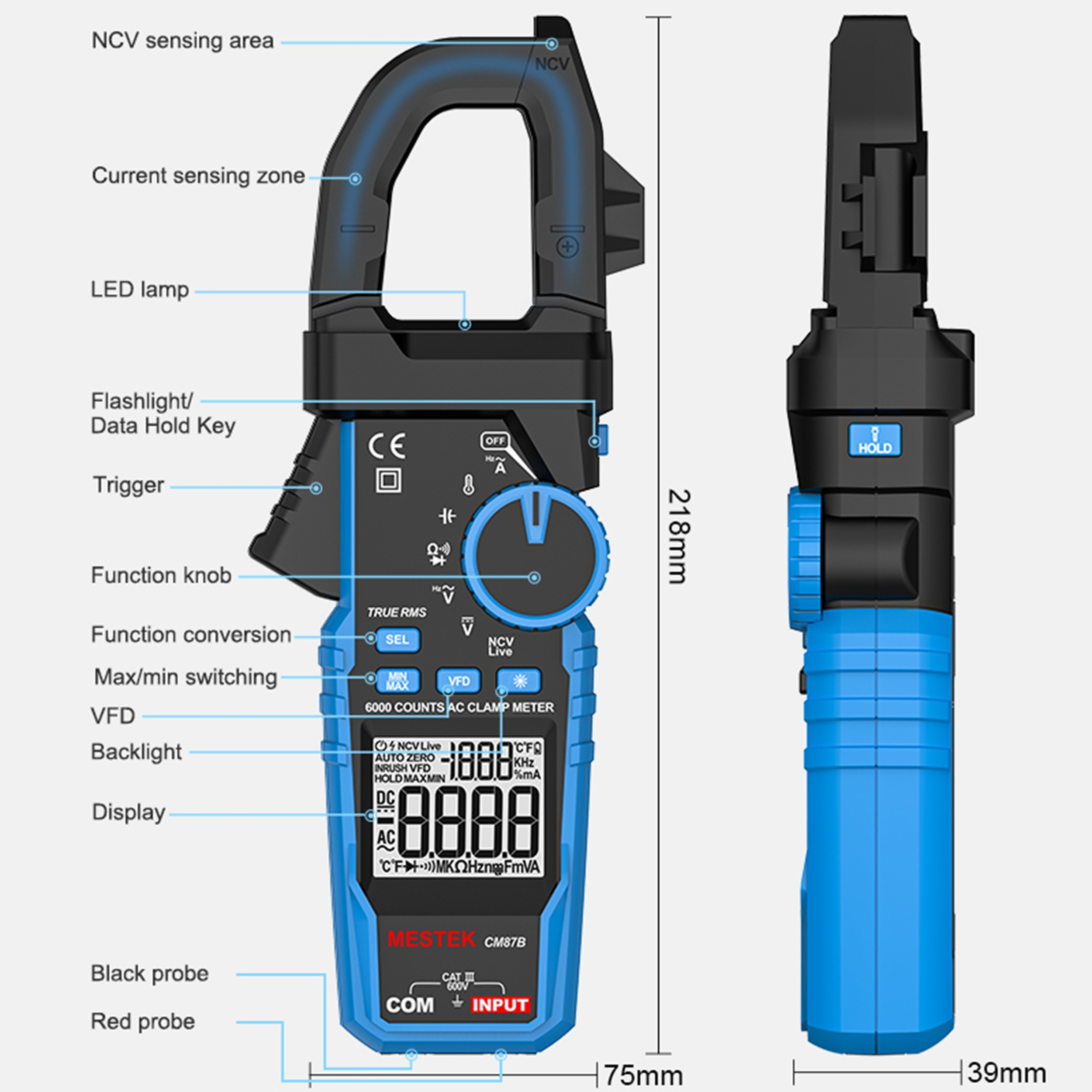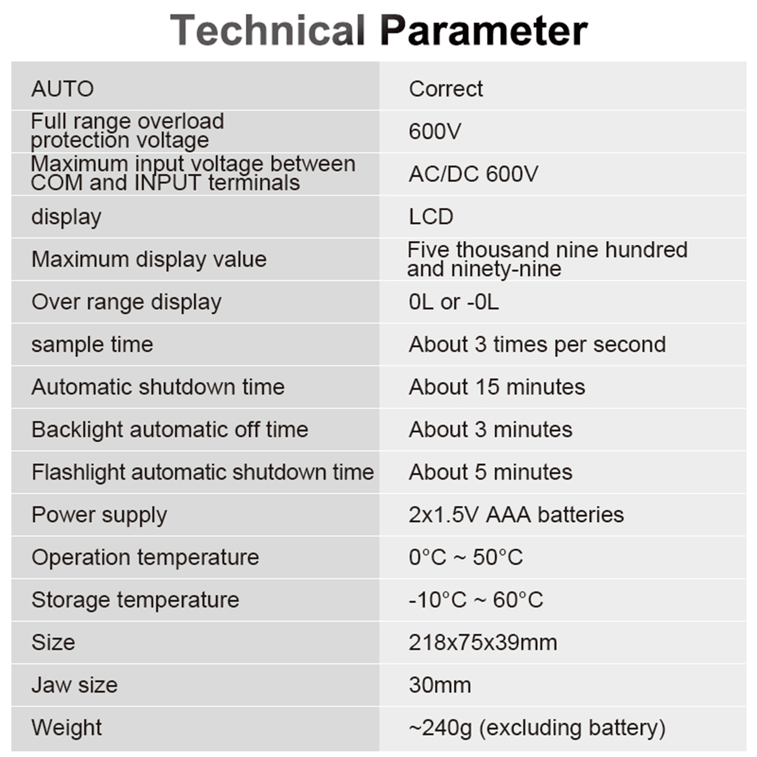 زمان نمونه برداری حدود 3 بار در ثانیه ،زمان خاموش شدن خودکار حدود 15 دقیقه ، اندازه فک 30 میلی متر ،True RMS، تشخیص ولتاژ غیرتماسی (NCV) ، اندازه‌گیری جریان AC ، اندازه‌گیری ولتاژ AC/DC ،ثبت مقادیر (Data Hold)
