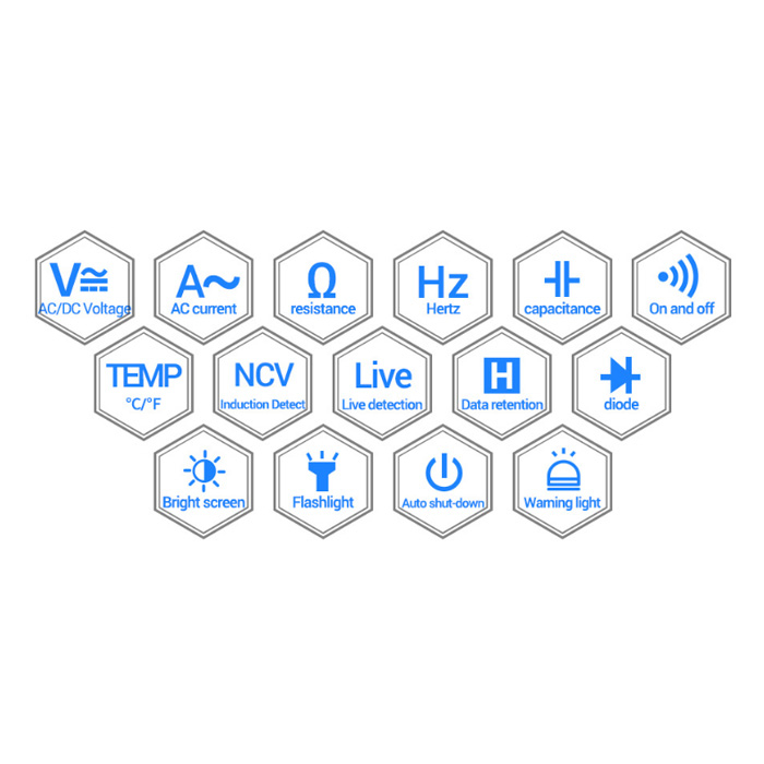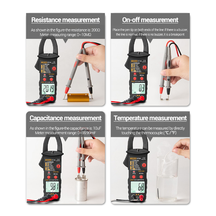 این کلمپ متر همه کاره هوشمند نوع جریان مستقیم یا متناوب توسط دستگاه را تشخیص داده و برای اندازه گیری سه پارامتر ولتاژ متناوب ، ولتاژ مستقیم ، مقاومت و اتصال کوتاه نیازی به انتخاب پارامتری نمی باشد و دستگاه توسط پروبها بصورت هوشمند تشخیص داده و مقدار آن را نمایش می دهد که این شامل وضعیت دیود ، بیزر ، خازن سنجی ، دماسنجی و… میشود