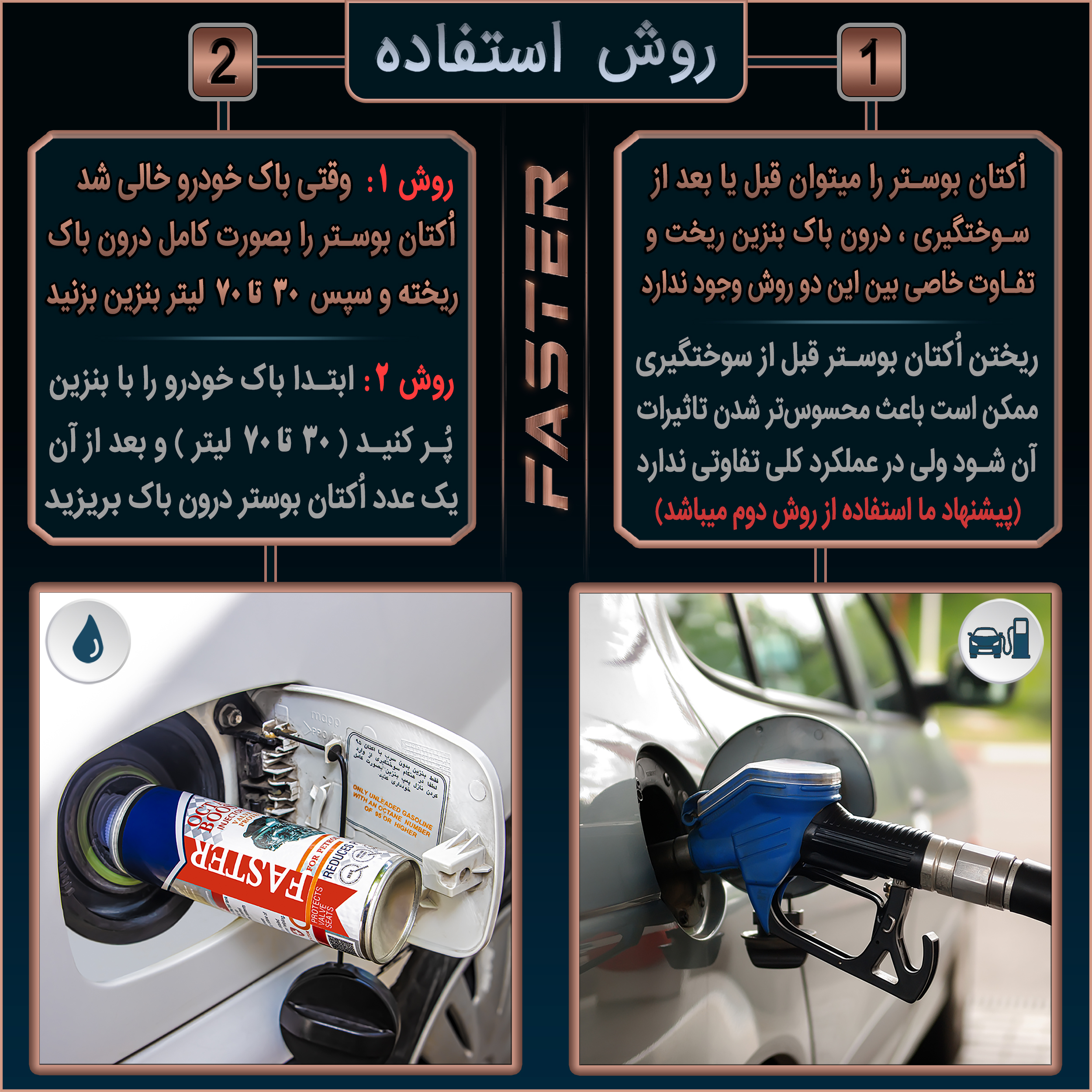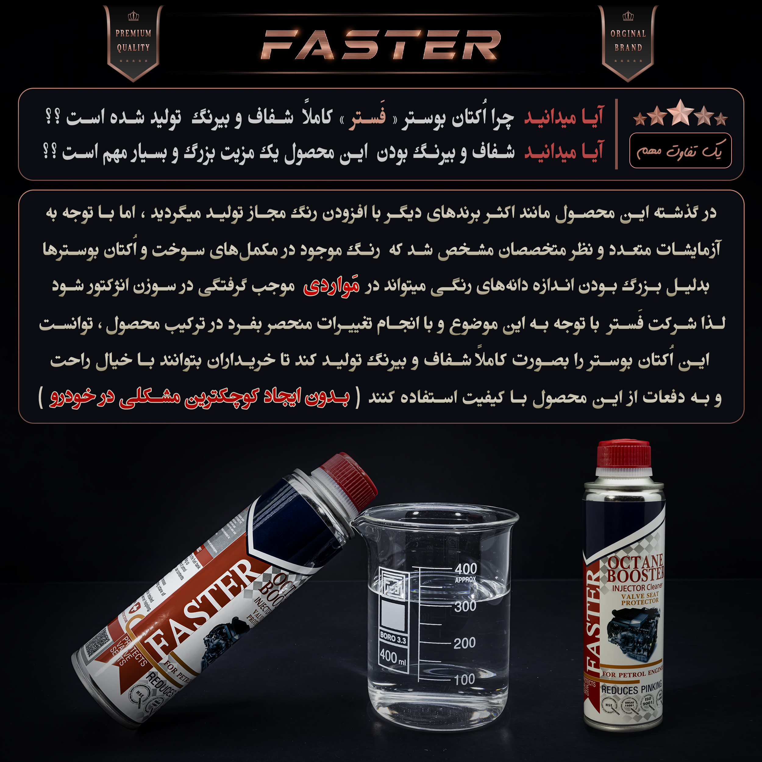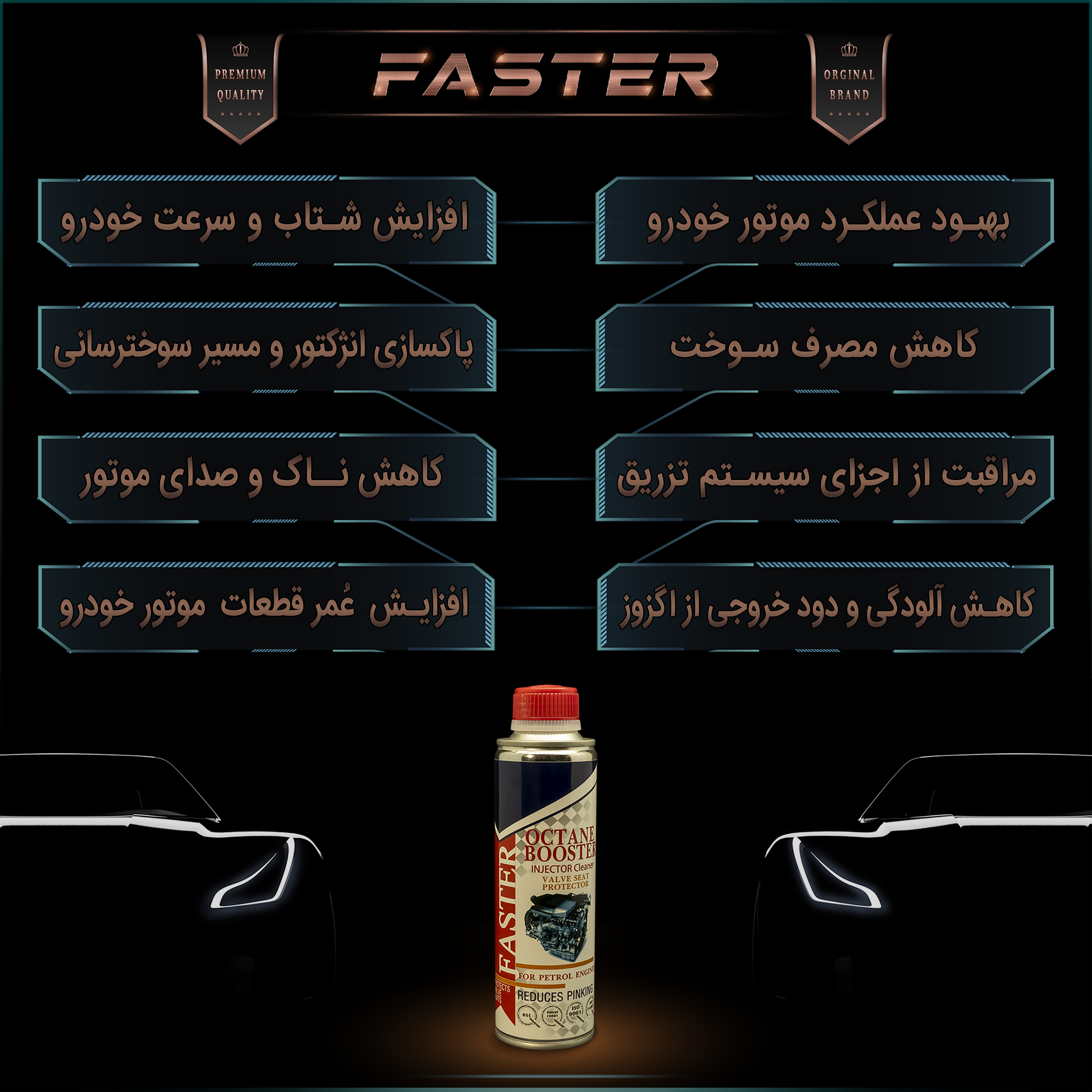 مصرف بالای بنزین خودرو، خوب کار نکردن موتور و کاهش سرعت و شتاب خودرو، دلایل متعددی می‌تواند داشته باشد که اصلی‌ترین آن ته‌نشینی رسوبات و آلودگی‌‌ها در مسیر سوخت رسانی، انژکتور و همچنین در موتور خودرو است. این رسوبات و آلودگی‌‌ها باعث می‌شود موتور خودرو نتواند به‌صورت نرمال و خوب کار کند و درنتیجه مصرف بنزین افزایش پیدا کند و نیز سرعت و شتاب خودرو کاهش پیدا می‌کند. همچنین پائین آمدن درجه اکتان بنزین نیز می‌تواند دلیل دیگری در ایجاد این مشکلات باشد. محصول فوق یک مکمل سوخت و اکتان بوستر با برند خوشنام «فستر» (FASTER) است که در حجم 300 میلی‌لیتر عرضه شده و علاوه‌بر قیمت مناسب و رقابتی این کالا با محصولات مشابه برند‌ها ی دیگر، کیفیت بسیار خوبی داشته و پس‌از مصرف این مکمل می‌توان تاثیر محسوسی را در کاهش مصرف بنزین و همچنین افزایش سرعت و شتاب خودرو شاهد بود. عملکرد این مکمل به این‌صورت است که با اضافه کردن محتیات یک قوطی از آن به باک بنزین خودرو (همراه با 30 تا 70 لیتر بنزین)، کل مسیر سوخت رسانی را از رسوبات و آلودگی‌‌ها ی موجود در انژکتور و موتور تمیز کرده (این محصول رسوبات موجود روی دریچه ‌ها ی انژکتور، سوپاپ‌‌ها ی ورودی، شمع موتور و محفظه احتراق را از بین می‌برد و از تشکیل مجدد آن‌ها جلوگیری می‌کند) و همچنین با بالا بردن درجه اکتان بنزین، به عملکرد بهتر موتور و انژکتور خودرو کمک کرده که درنتیجه با کاهش مصرف سوخت و افزایش شتاب و سرعت خودرو همراه خواهد بود. این ماده از تمام اجزای تشکیل دهنده سیستم تزریق سوخت مراقبت کرده و کل سیستم سوخت‌رسانی را از زنگ‌زدگی و خوردگی محافظت می‌کند. به‌علاوه تراکم و واکنش دریچه گاز را را بهبود می‌بخشد. تاثیر استفاده یکبار از این محصول تا حدود 1000 کیلومتر باقی خواهد ماند.