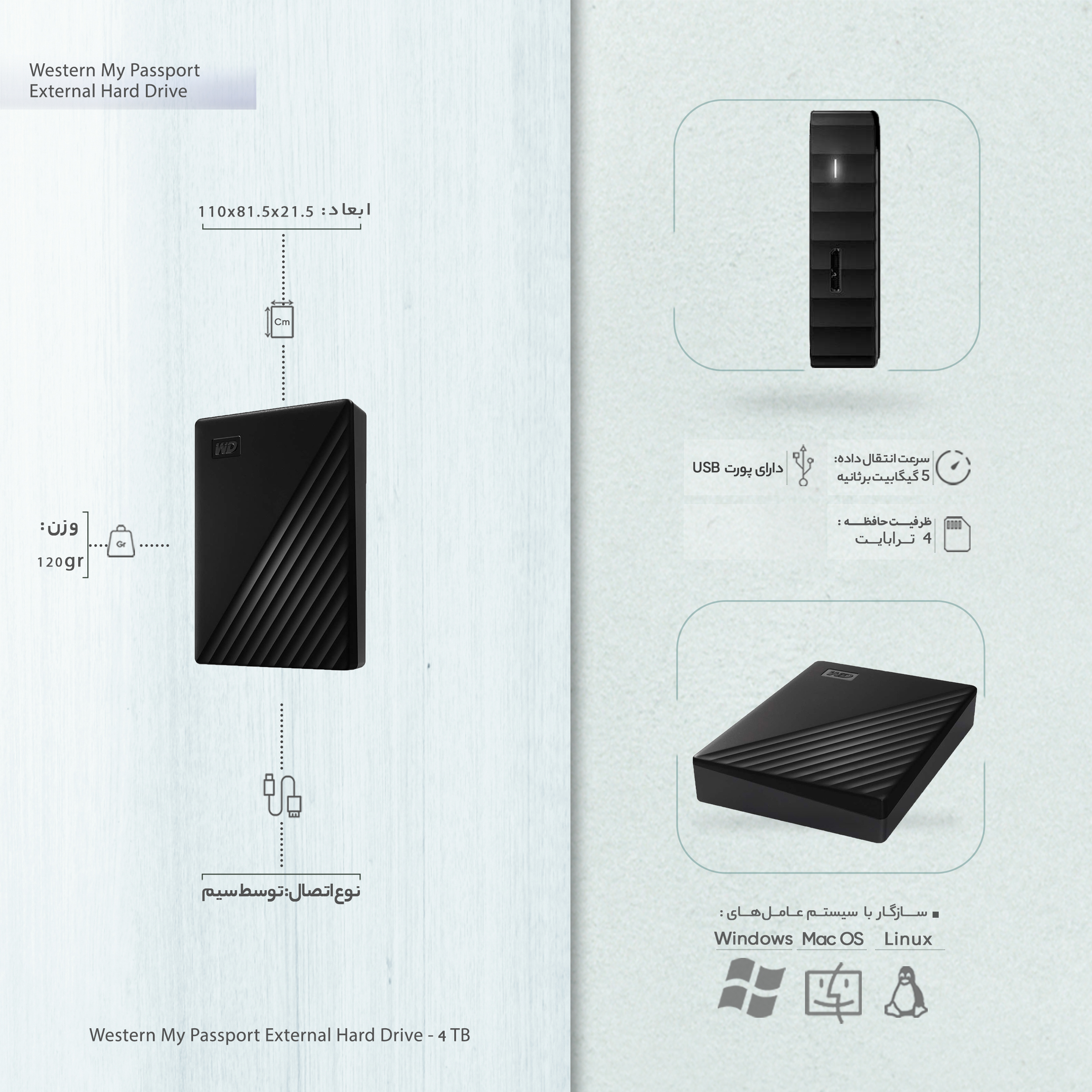 هارد اکسترنال وسترن دیجیتال مدل My Passport ظرفیت چهار ترابایت دارای رابط USB Type-A 3.0