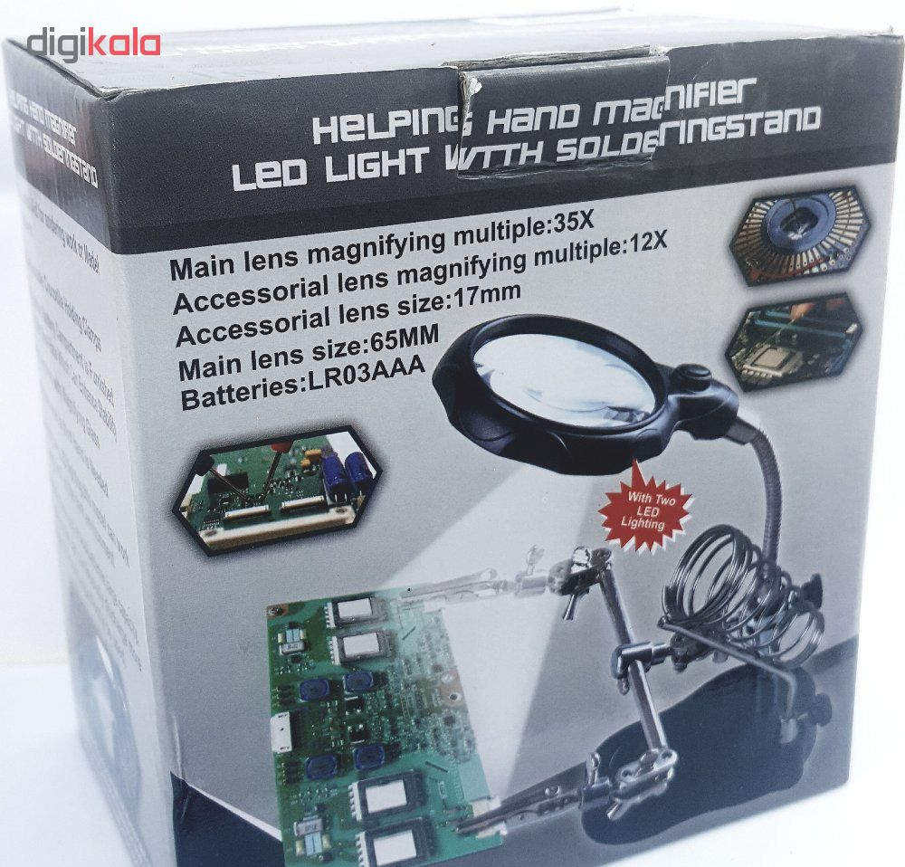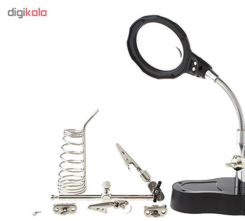 این کالا نوعی گیره و پایه هویه مجهز به ذره بین با قدرت بزرگ نمایی 12x و 3.5x میباشد که دارای 2 عدد ال ای دی جهت روشن کردن سطح کار و هم چنین گیره های متحرک جهت نگهداره برد های الکترونیک.است