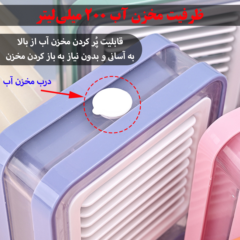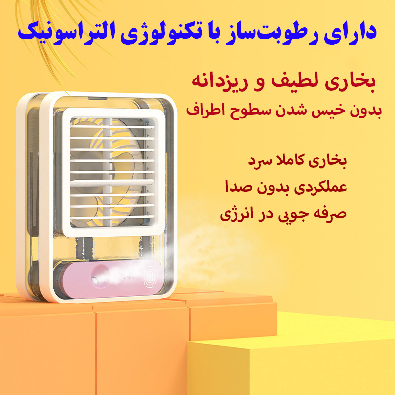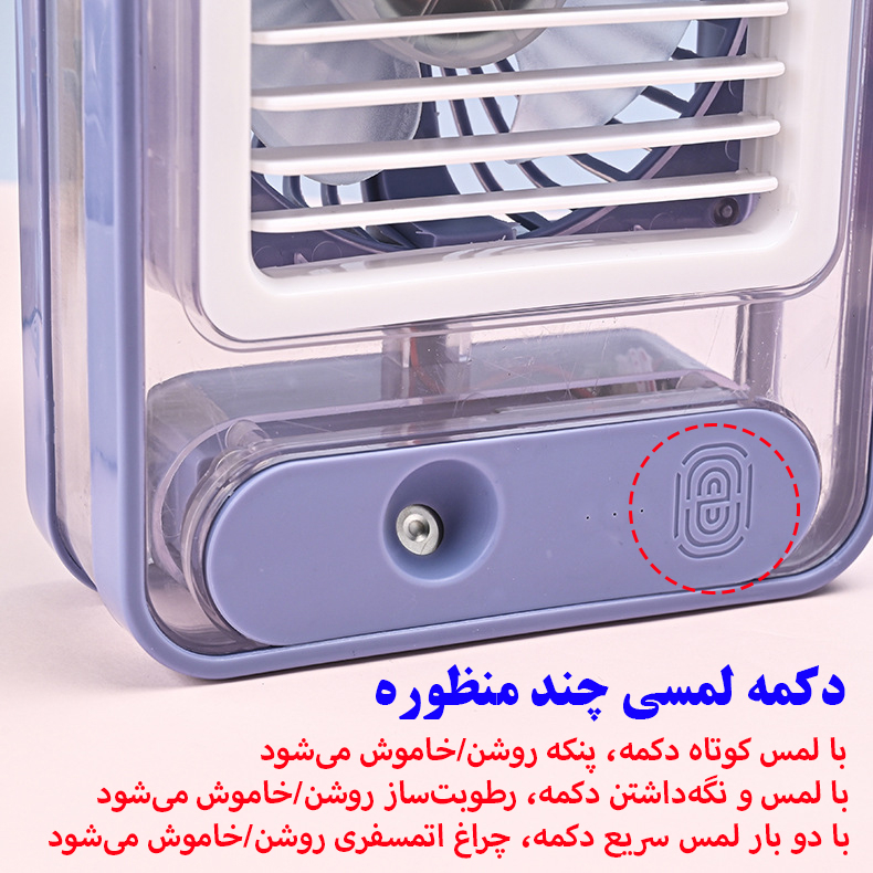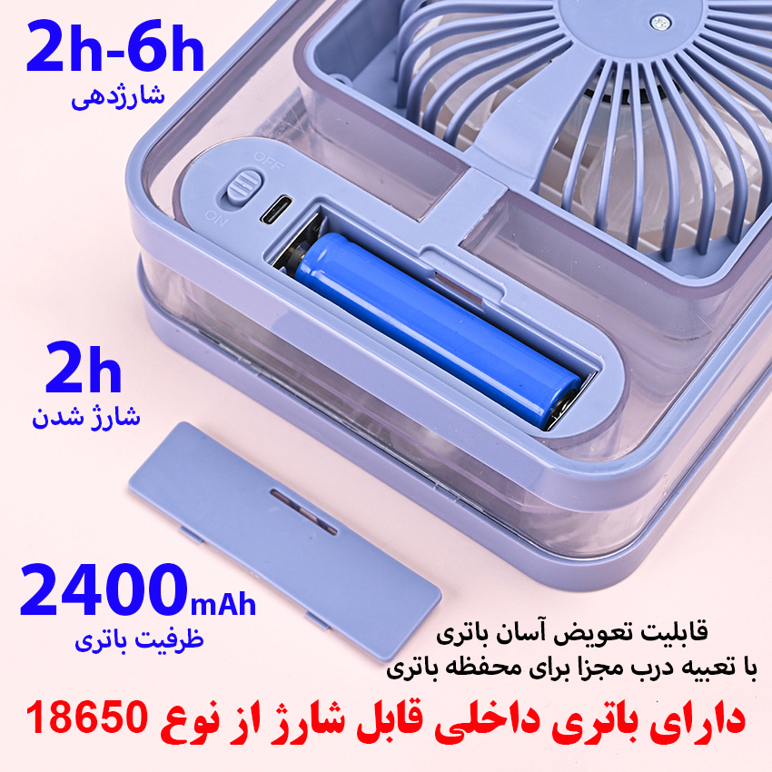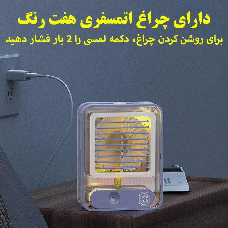 قدرت باد فوق‌العاده - قابلیت تنظیم زاویه وزش باد - باتری 2400 میلی‌آمپر - دارای سه حالت سرعت باد - قابلیت رطوبت‌ساز - مخزن آب 200 میلی‌لیتری - دکمه لمسی - دارای چراغ اتمسفری 7 رنگ - بسیار کم صدا