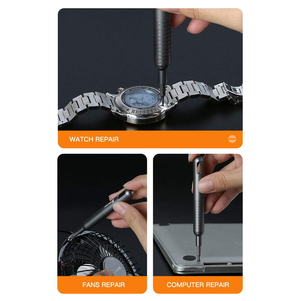 شما با تهیه­‌ی این محصول می­توانید تمام تعمیرات خود را در هر زمینه­ای انجام دهید، برای مثال،به راحتی می‌توانید پیچ‌های عینک خود را با PGS100 باز و بسته کنید و در صورت نیاز، فریم آن را تنظیم کنید. PGS100 برای باز کردن پیچ‌های اسباب‌بازی‌های کودکان و تعمیر آنها ایده‌آل است. از PGS100 برای باز کردن درب باتری‌ها، تعویض قطعات و انجام سایر تعمیرات جزئی در وسایل الکترونیکی خود استفاده کنید. به طور کلی، PGS100  برای هر کسی که به دنبال یک پیچ گوشتی همه کاره، جمع و جور و کاربردی است، مناسب است.