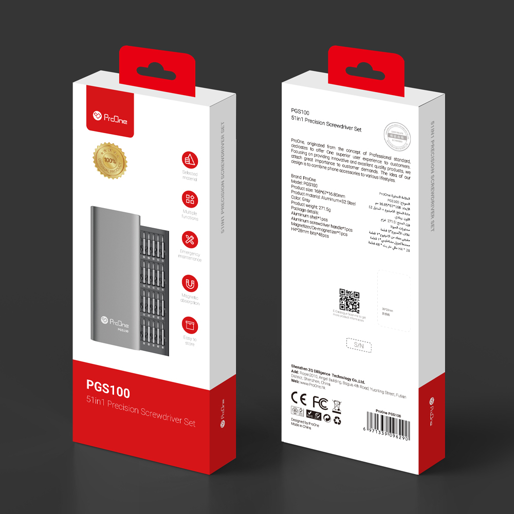 یکی از مزایای اصلی پیچ گوشتی همه کاره PGS100، بسته بندی جمع­و­جور آن است. این ویژگی باعث می‌شود که به راحتی بتوانید آن را در کیف، جیب یا داشبورد ماشین خود حمل کنید. به این ترتیب، PGS100 همیشه در دسترس شما خواهد بود و می‌توانید در هر مکانی که نیاز به تعمیر یا باز و بسته کردن چیزی دارید از آن استفاده کنید. تمام اطلاعات و کاربری­های محصول و تمام استانداردهای طی شده توسط آن نیز بر روی بسته­‌بندی قابل مشاهده است.