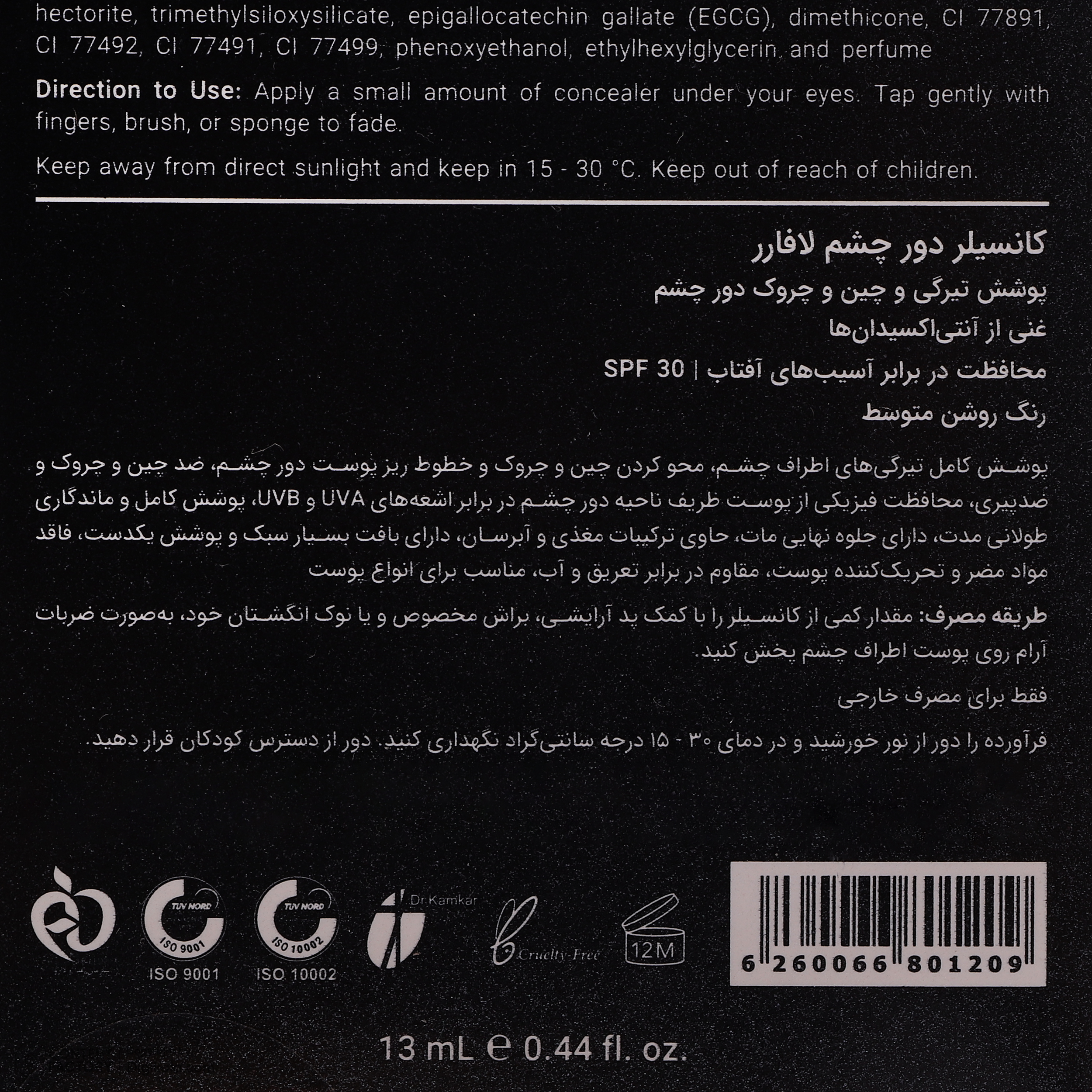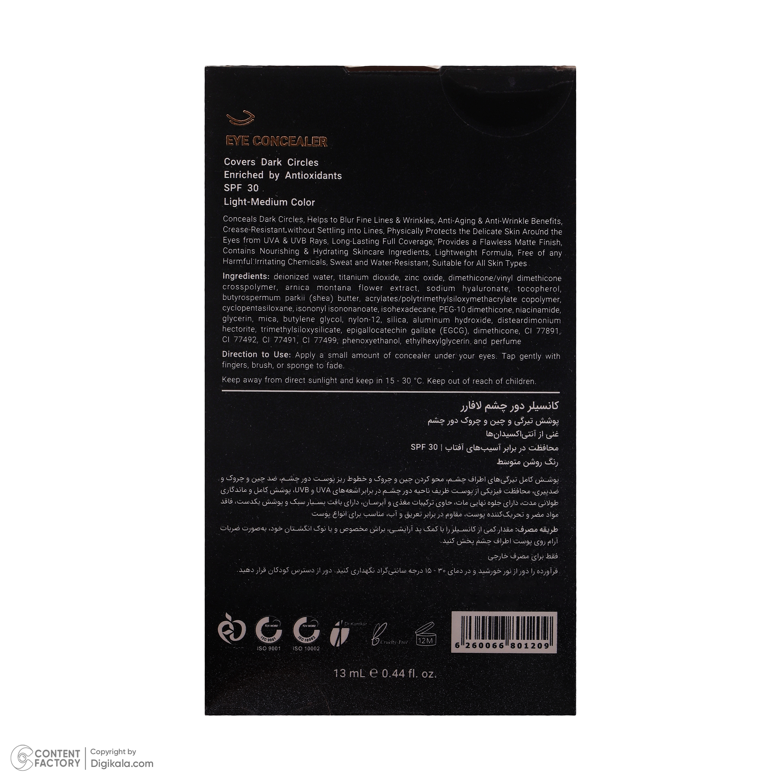 - سایر توضیحاتپوشش کامل تیرگی اطراف چشم/ محو کردن چین و چروک و خطوط ریز پوست دور چشم/ ضد پیری/ محافظت فیزیکی از پوست در برابر اشعه UVA و UVB/ ماندگاری طولانی مدت/ دارای جلوه نهایی مات/ حاوی ترکیبات مغذی و آبرسان/ دارای بافت سبک و پوشش یکدست/ فاقد مواد مضر و تحریک کننده پوست/ مقاوم در برابر تعریق و آب.