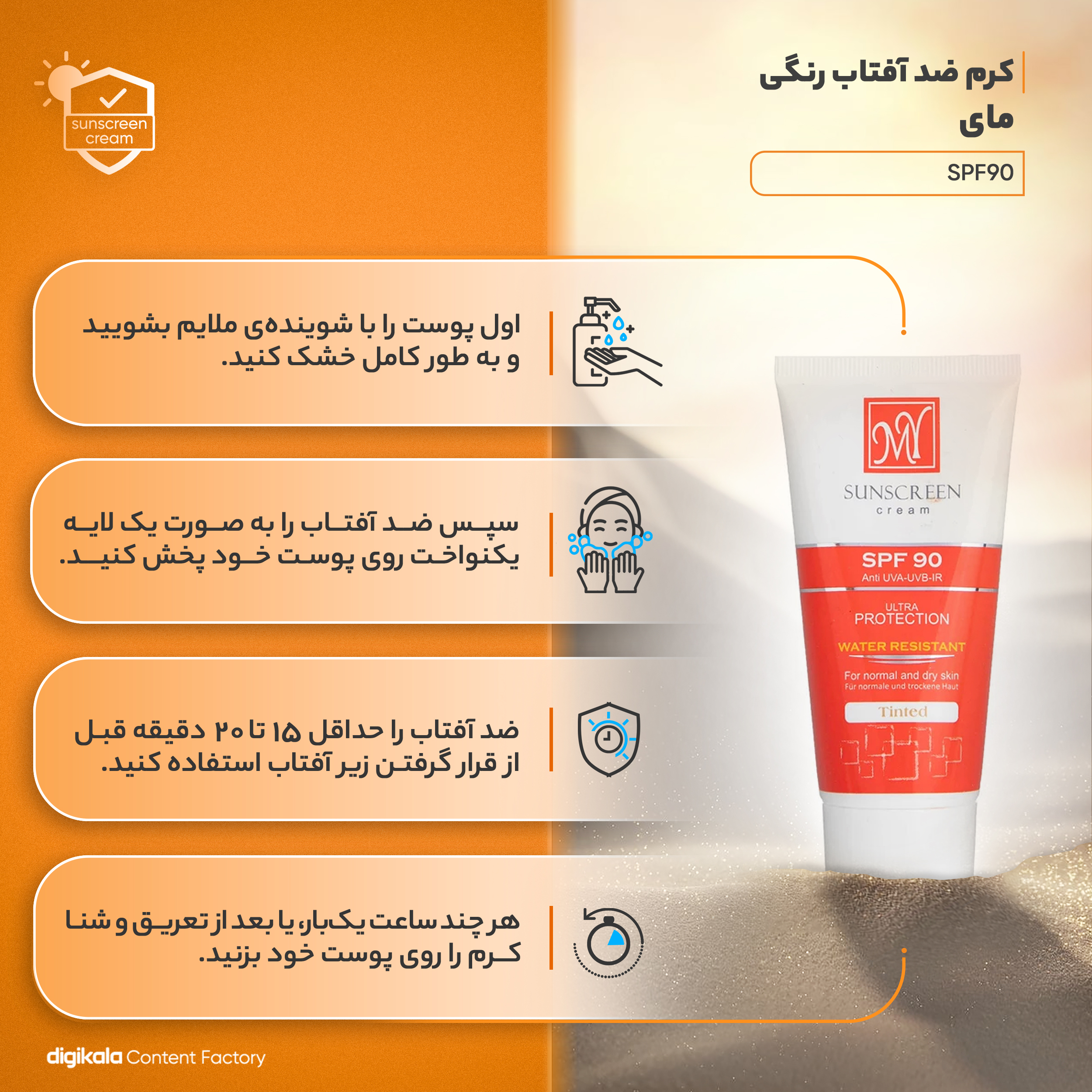 برای استفاده از کرم ضد آفتاب رنگی مای SPF90، میتوانید مراحل زیر را دنبال کنید:
