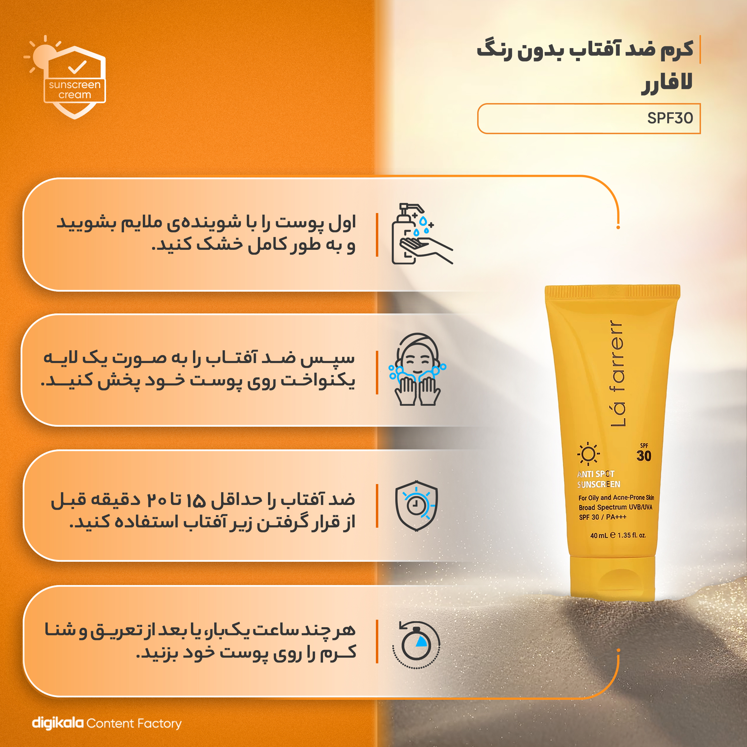 کرم ضدآفتاب و ضدلک بی‌رنگ لافارر مدل SPF30، مناسب پوست‌های چرب، حجم 40 میلی‌لیتر